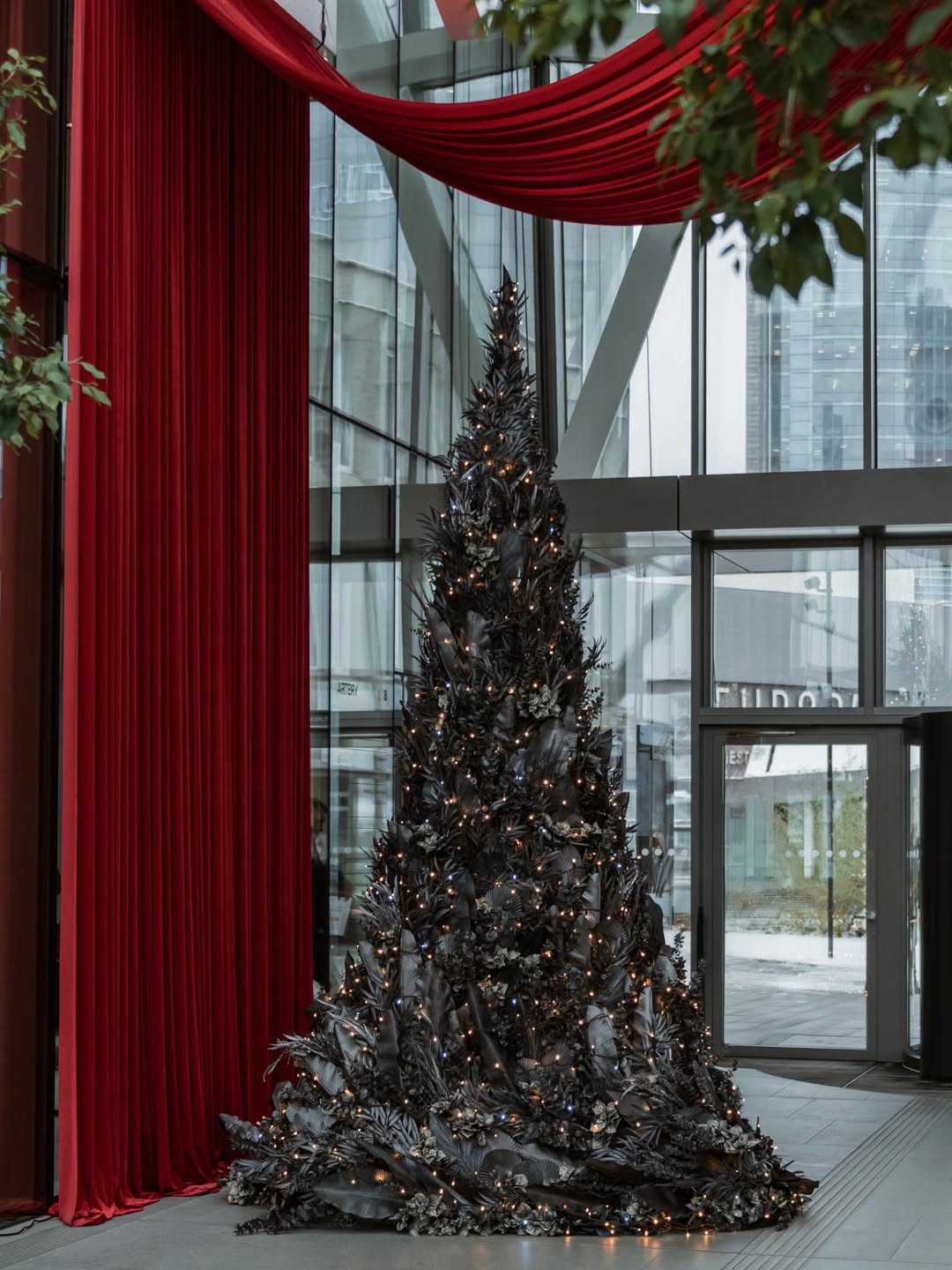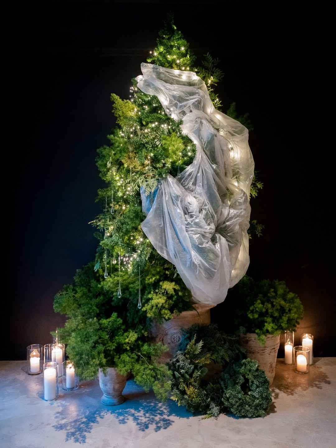A Christmas tree wedding backdrop can feel more like an art installation, making the tree the main sculptural element rather than just a festive detail. These trees go beyond simple ornaments. They are three-dimensional designs that might use surprising materials, include hanging elements, or be arranged in ways that challenge your idea of what a tree is. You can clearly see the influence of fashion design here. The creative approach used in runway installations often shows up in wedding Christmas tree decorations, which sometimes look more like works of art than playful decor.