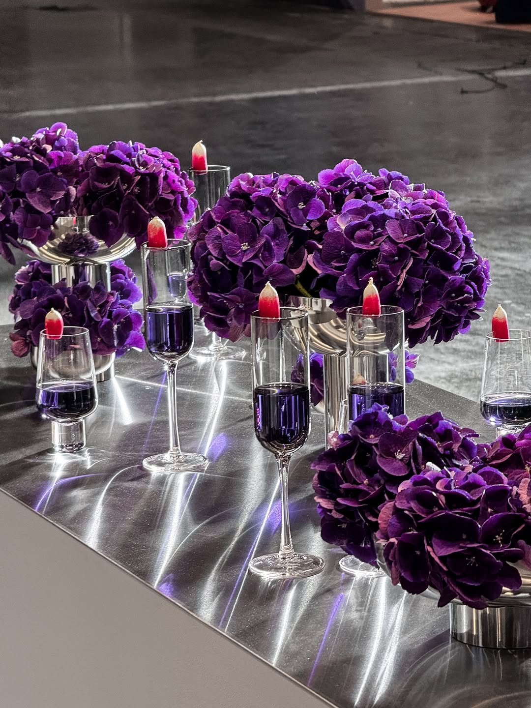 - Floral arrangements featuring delphiniums, hydrangeas, and sweet peas