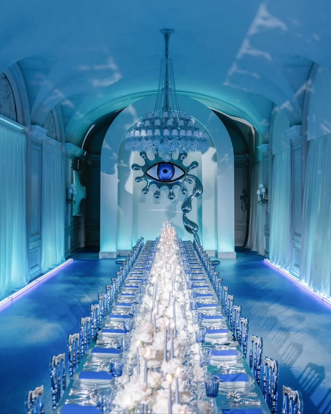 - Table settings with blue glassware or china details
