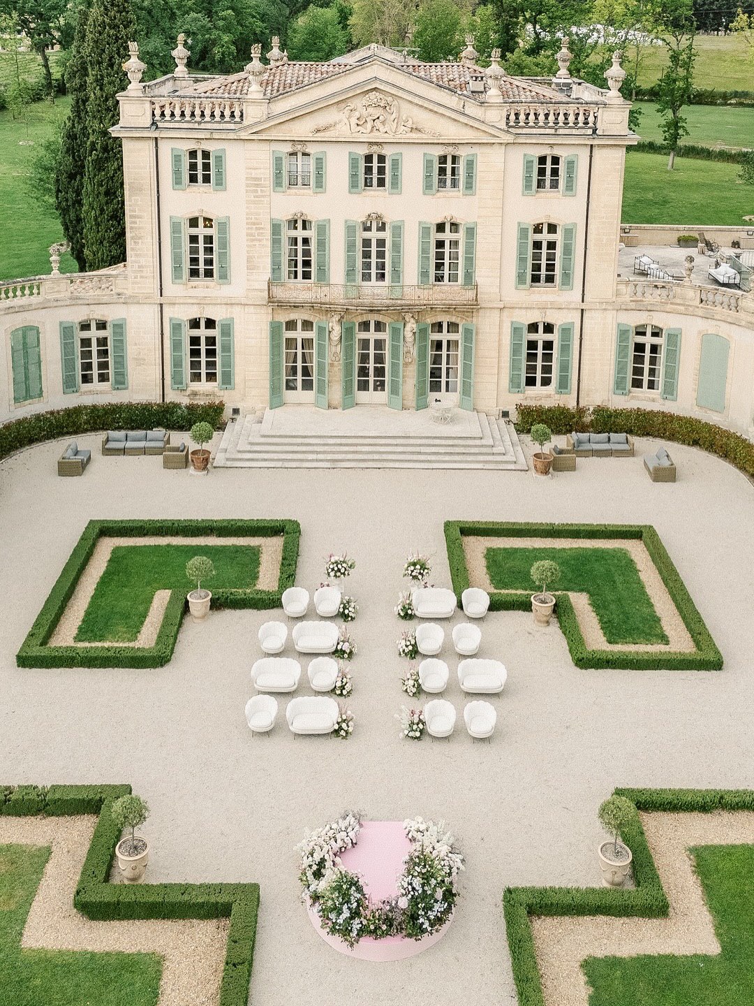 Private castles and historic estates stand out among backyard wedding ideas. They offer impressive architecture and extensive grounds while still maintaining the intimate, exclusive feel of a backyard celebration. Unlike public venues with set schedules and vendor lists, these private properties let you control every detail, from the ceremony time to the after-party playlist. The architecture becomes the main decoration, so you don't need lots of flowers or artificial decor like at many traditional venues. Old stone walls, grand staircases, and carefully designed gardens add a dramatic look that rented arches or fabric can't match. Estate weddings make the most of this beauty, with ceremonies at the base of staircases, vows in formal gardens bordered by boxwood hedges, or quiet moments in covered walkways with views of the landscape. For the reception, courtyards and terraces turn into outdoor dining rooms that feel both grand and private. Long tables in the courtyards look like banquet halls but still feel as relaxed as a backyard gathering. The stone walls also help block wind and noise, making the space comfortable and private.