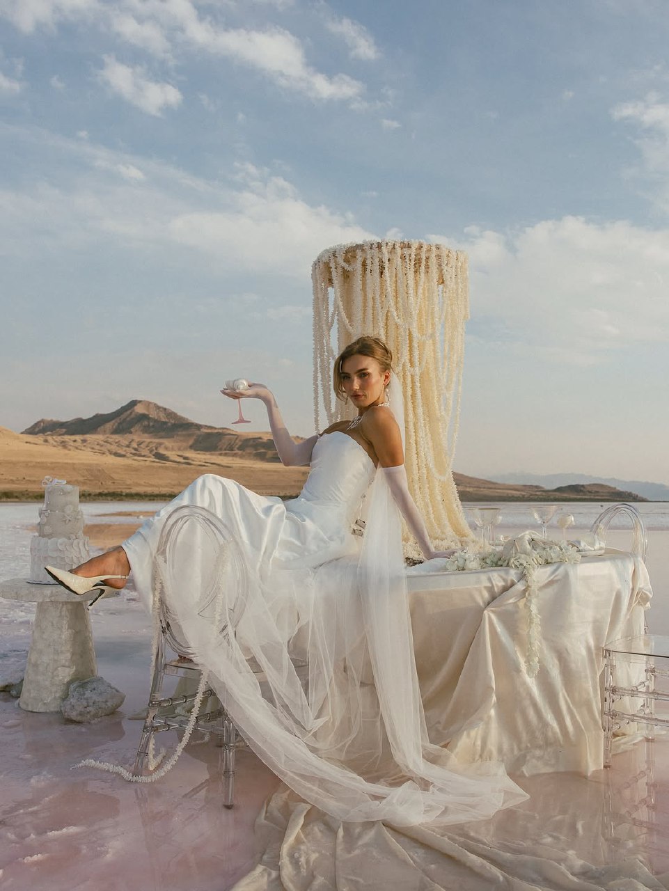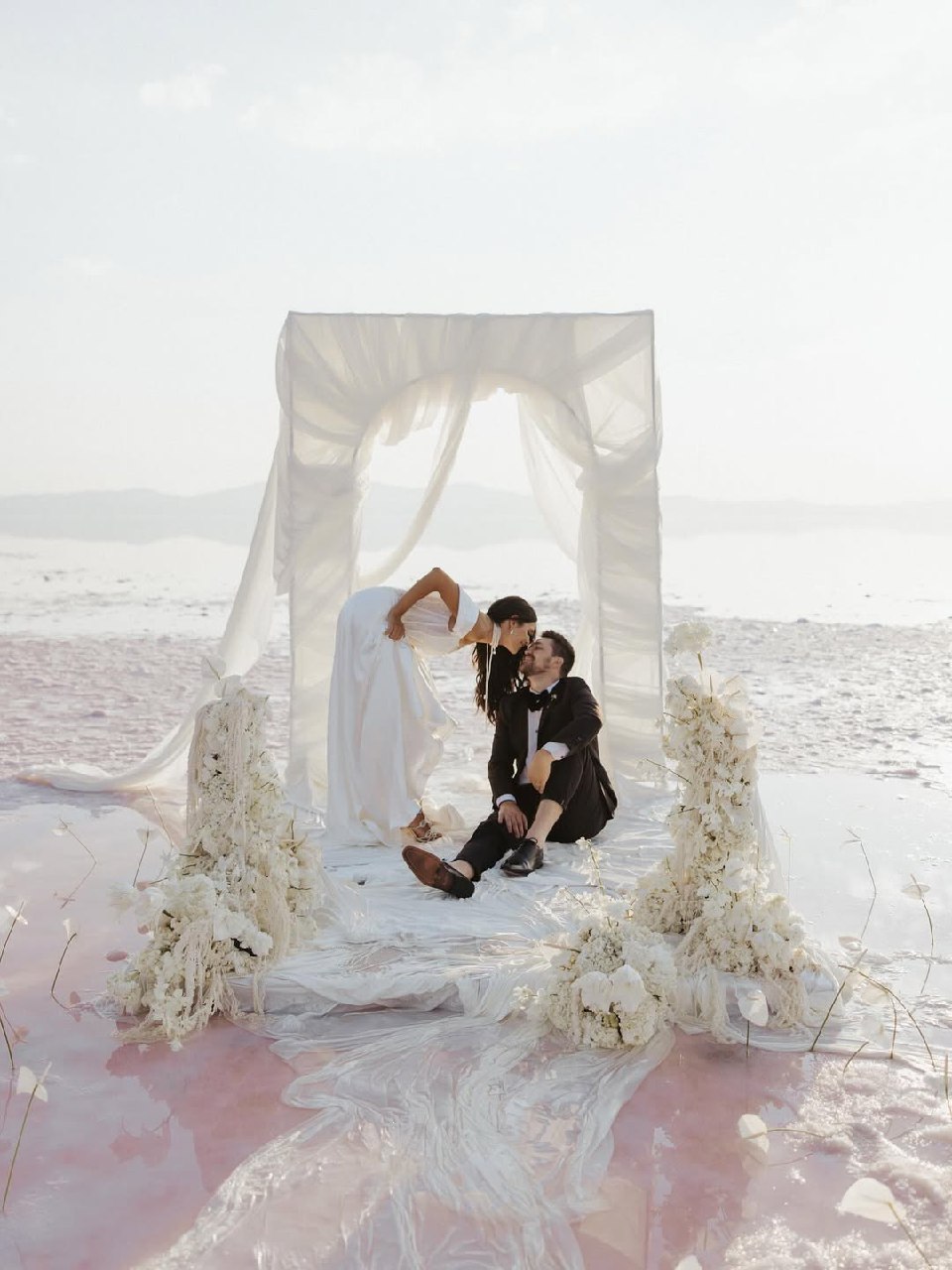 Sand dunes, red rock formations, and views stretching as far as the eye can see. When planning an elopement photoshoot in the desert, it's best to keep the style minimalist and dramatic. The environment is full of bold shapes and textures, so you don't need to overcomplicate the styling. Think flowing fabrics that move with the wind, neutral colours that don't compete with natural landscapes, or bold shapes that create interesting contrast. The style is naturally boho and minimalist. Morocco, Utah's canyon country, Atacama, the Sahara, and Joshua Tree each have their own unique desert landscapes. The best time to take photos is just after sunrise or just before sunset. The light is soft and warm at these times, making everything look beautiful. Sunrise works really well, too. Things to think about: heat, wind, and sand will be everywhere.