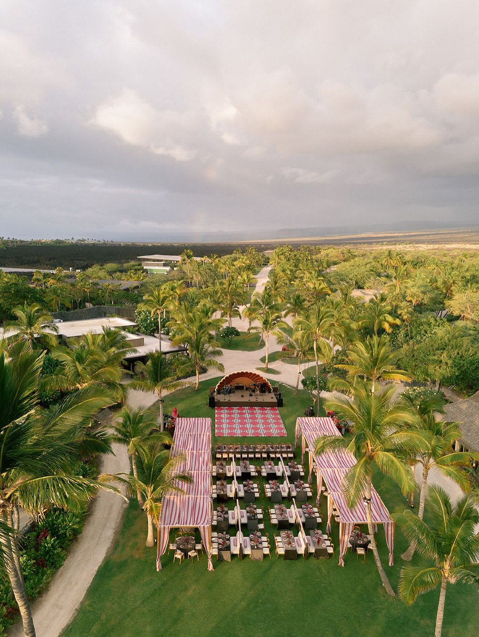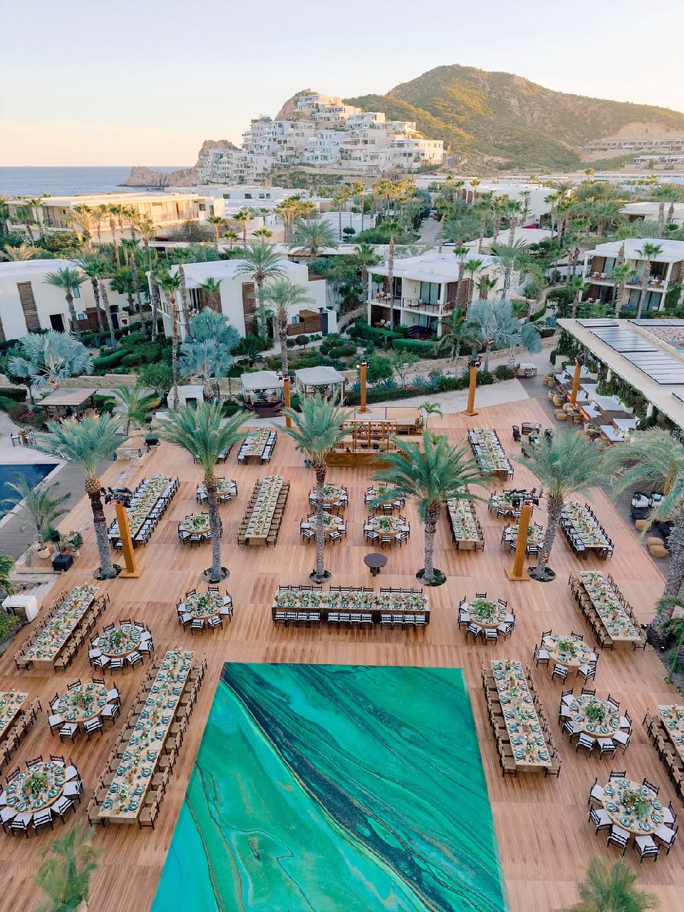 Ceremony structures should frame the landscape rather than block it. Positioning an arch or chuppah to frame mountain views or an ocean horizon in the background creates a focal point for the ceremony while maintaining the environmental context that drew you to this location in the first place. Consider not only the seating arrangement's symmetry but also what guests will actually see. Don't position the chairs so they face the couple's backs if it means everyone's view is of the lovely ceremony backdrop rather than the couple. Layered lighting creates an evening atmosphere — string lights, lanterns, and candles — and provides ambience as the natural light fades without overwhelming the space. Thoughtful lounge areas offer guests comfortable spaces to gather beyond assigned seating, while refined tablescapes complement the setting rather than compete with it.