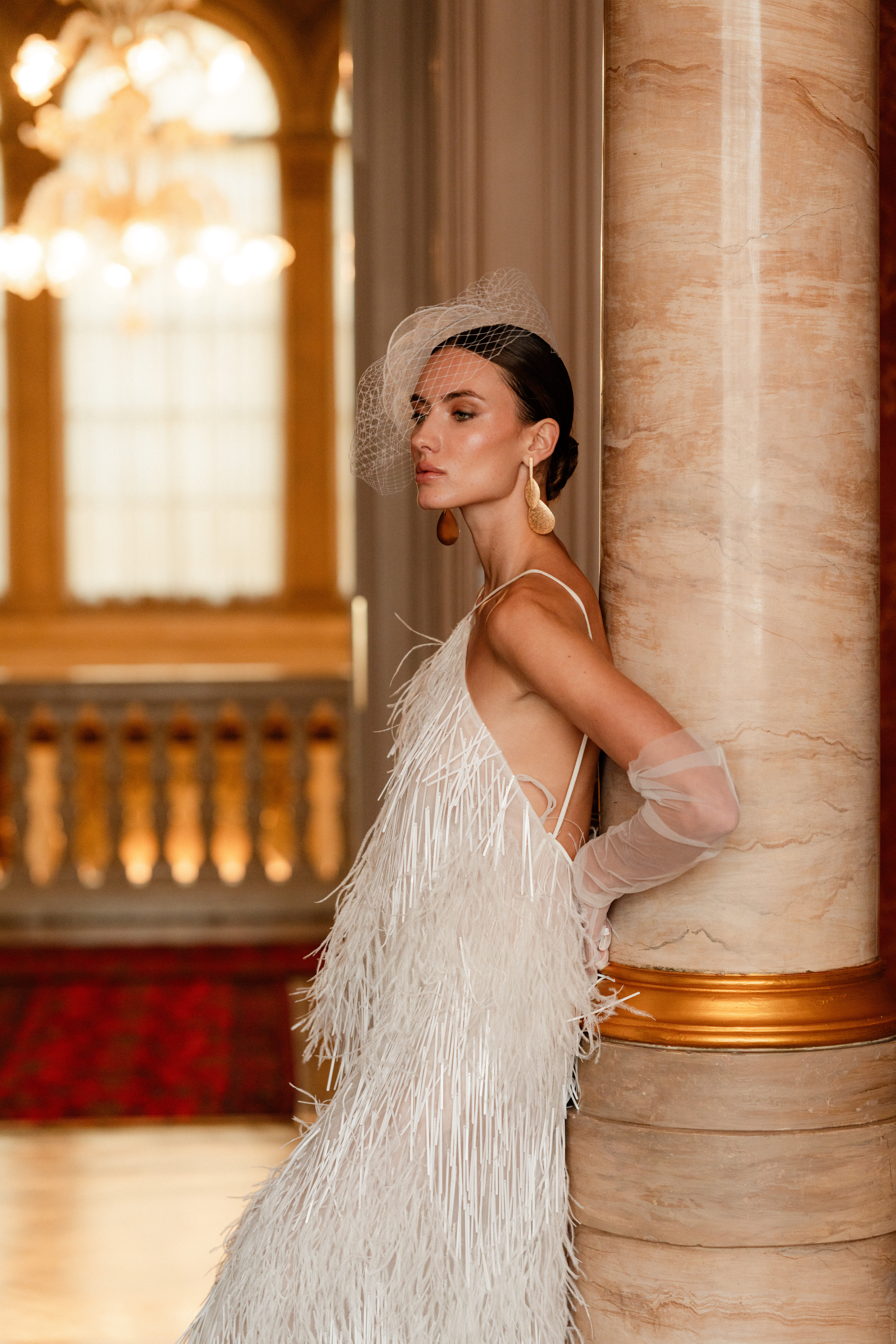 Every element of the editorial was shaped to let the story unfold naturally within the villa’s majestic yet intimate setting. The sculptural bridal gowns by @lebaobabsposa brought movement and quiet drama to the scene, draping elegantly through hallways and cascading down marble steps. The hair and makeup, styled by @blbsmanagement and @francescacalo_mua, highlighted each model’s natural beauty with modern refinement—fresh, glowy, and ethereal.