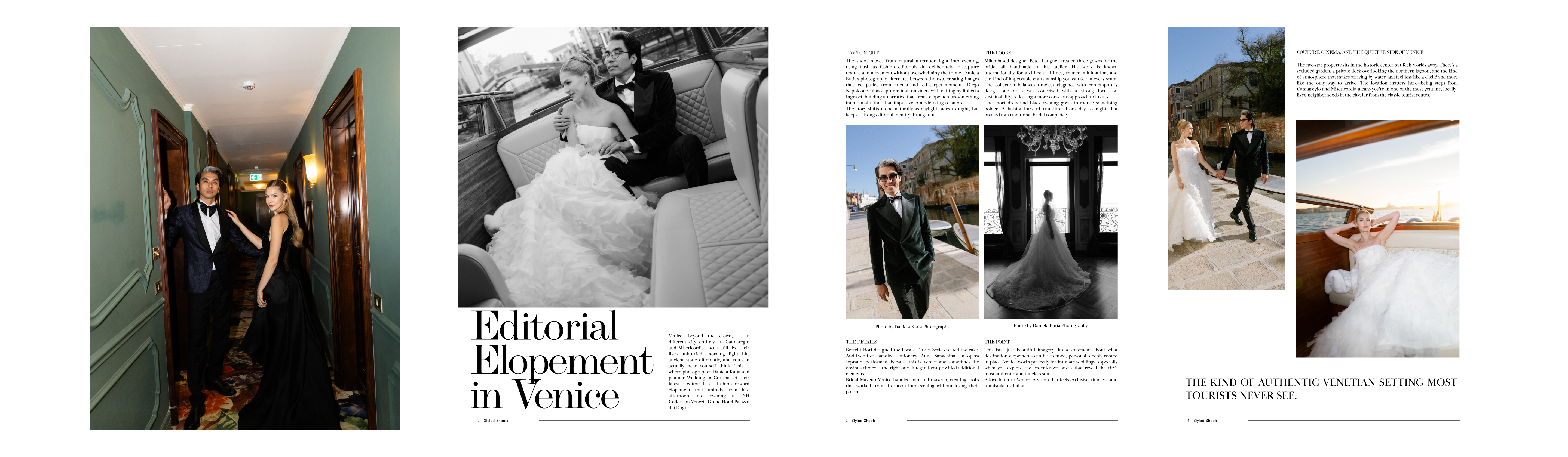 Venice, beyond the crowd, is a different city entirely. In Cannaregio and Misericordia, locals still live their lives unhurried, morning light hits ancient stone differently, and you can actually hear yourself think. This is where photographer Daniela Katia and planner Wedding in Cortina set their latest editorial—a fashion-forward elopement that unfolds from late afternoon into evening at NH Collection Venezia Grand Hotel Palazzo dei Dogi.