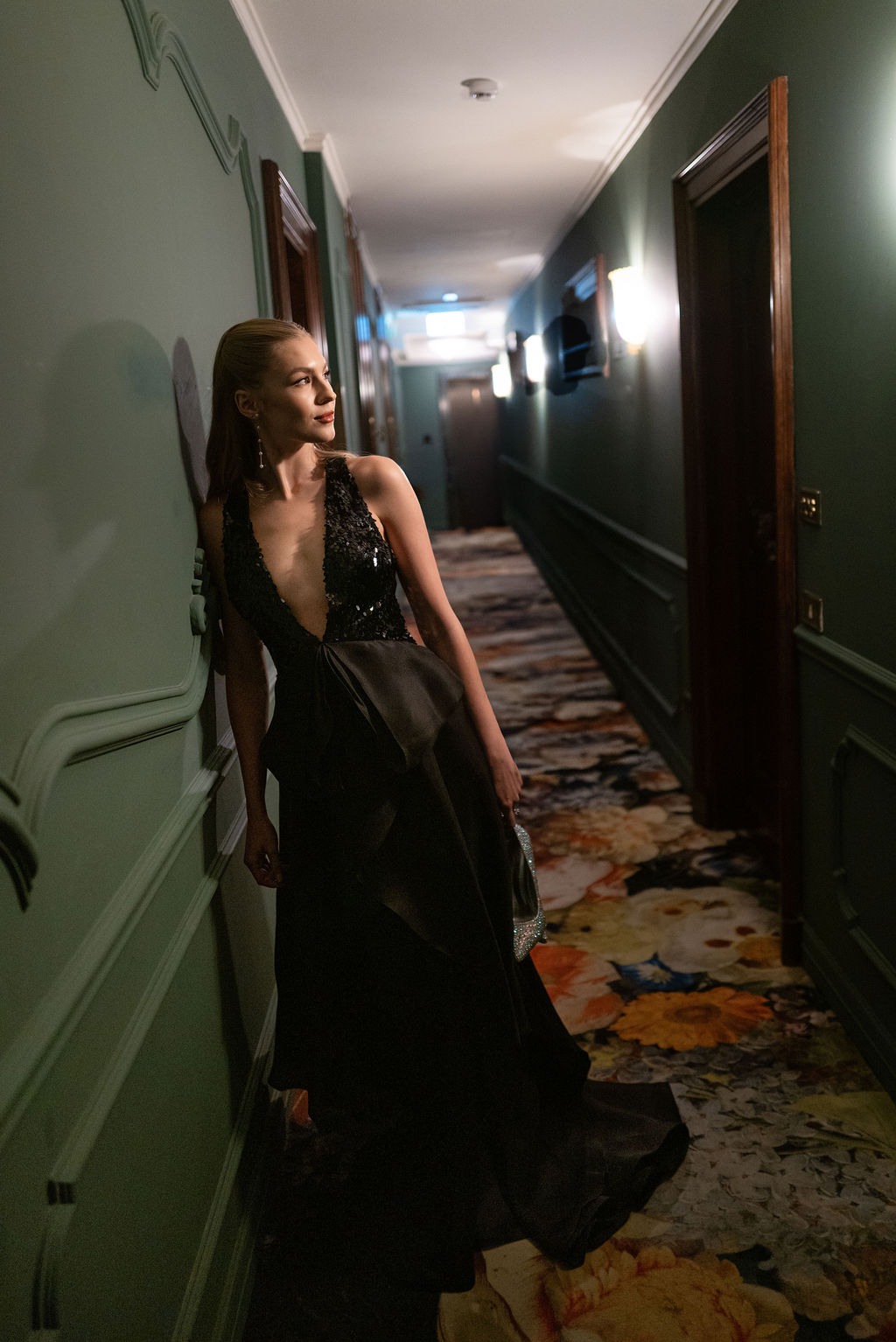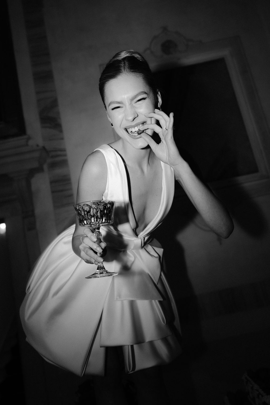 The short dress and black evening gown introduce something bolder. A fashion-forward transition from day to night that breaks from traditional bridal completely.