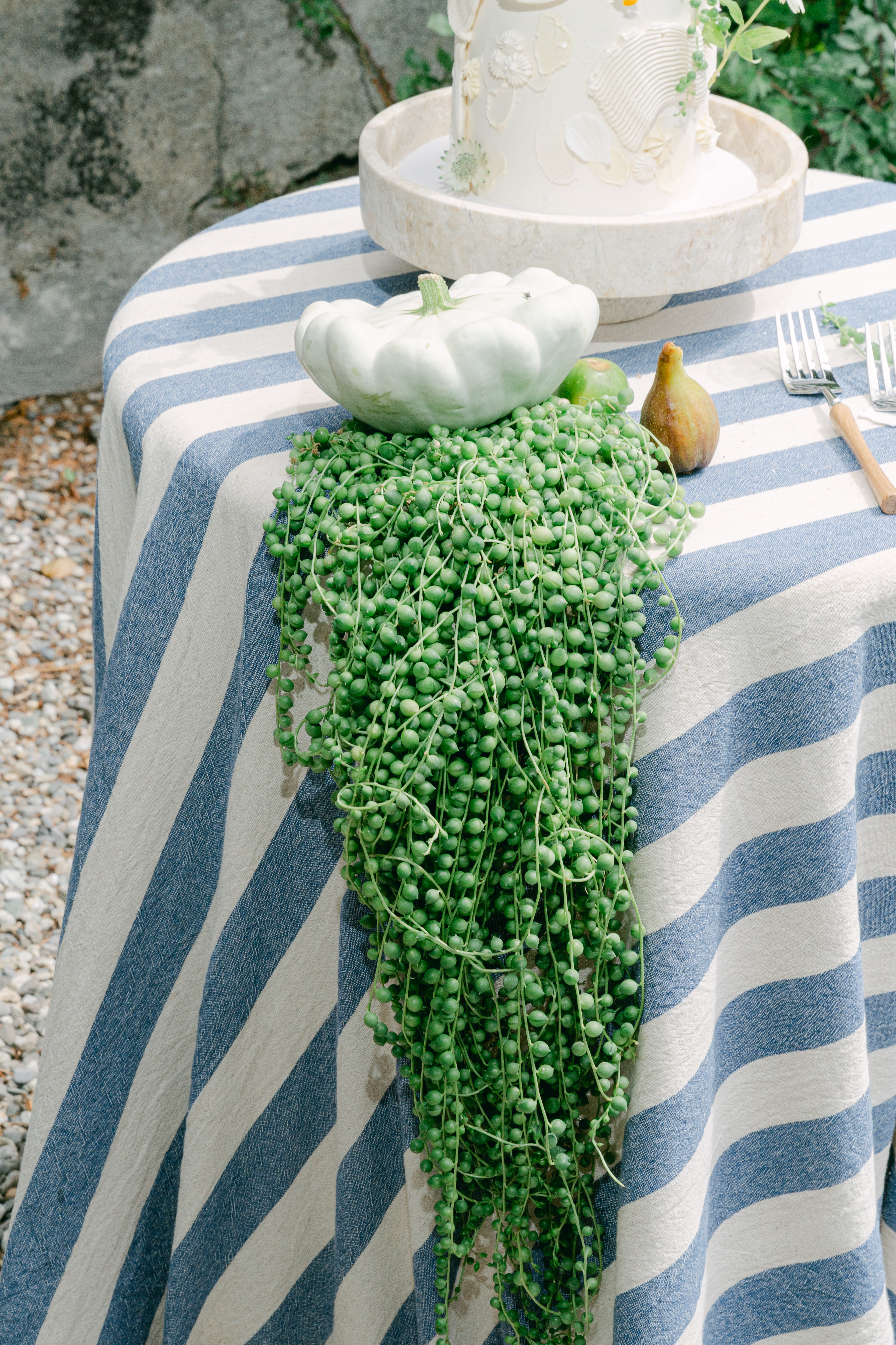 Presented on a simple stone pedestal with the blue-striped runner as backdrop, the cake is photographed against vine-covered walls and garden greenery—positioning it not as a mere dessert, but as part of the landscape itself.