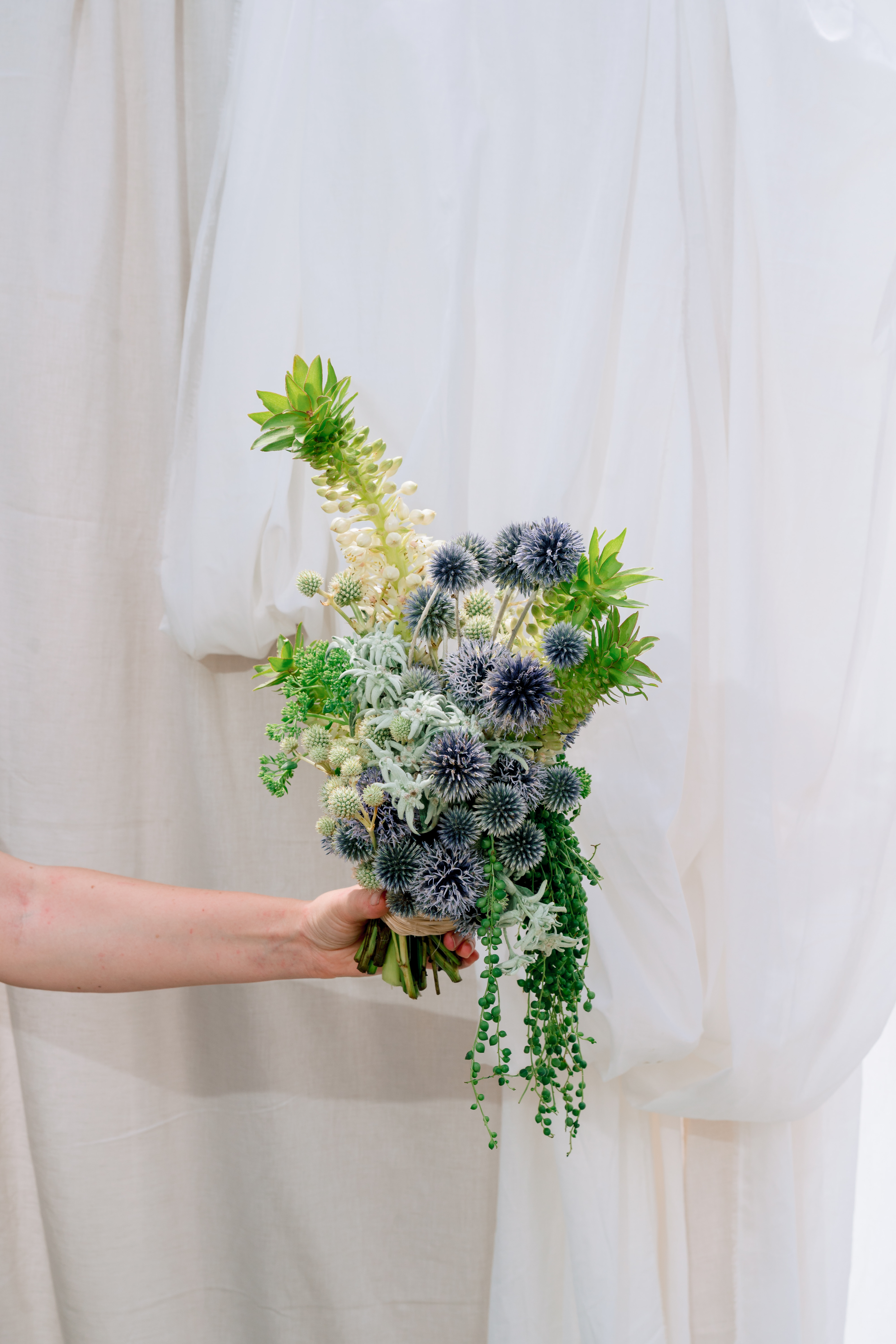 Table arrangements continue this ethos: butter-yellow ranunculus and roses in sculptural cream vessels, accented with pears and figs that blur the line between décor and dessert. The bridal bouquet is a masterclass in textural design—spiky blue thistle, trailing greenery, delicate white blooms, and architectural elements that create a cascading, almost wild silhouette. This is floral design that whispers rather than shouts. And in that restraint lies its power.