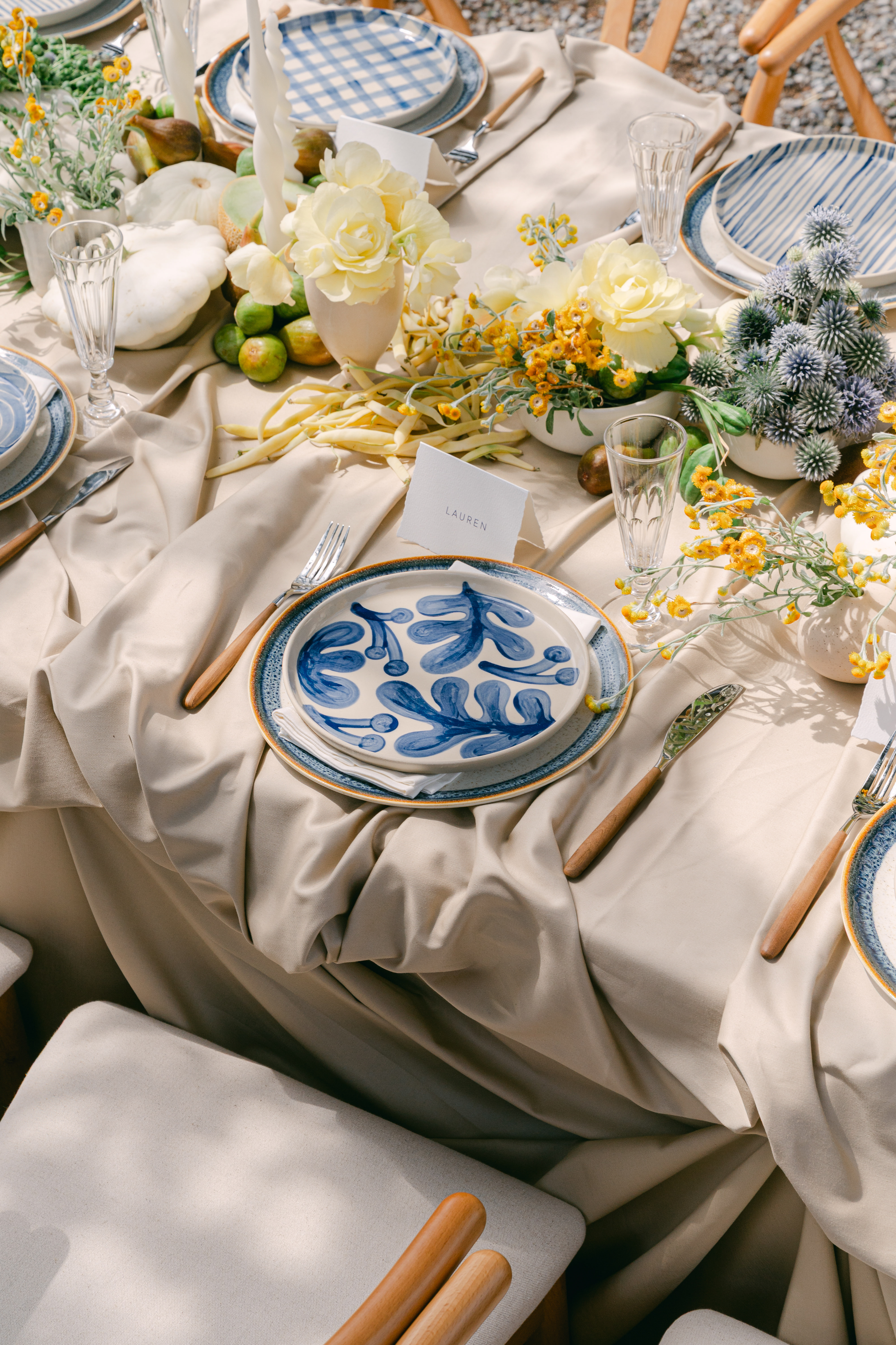 In August Company's hand-painted plates in blues and creams provide an artisanal foundation, while vintage-style cut crystal glassware catches the natural light beautifully.