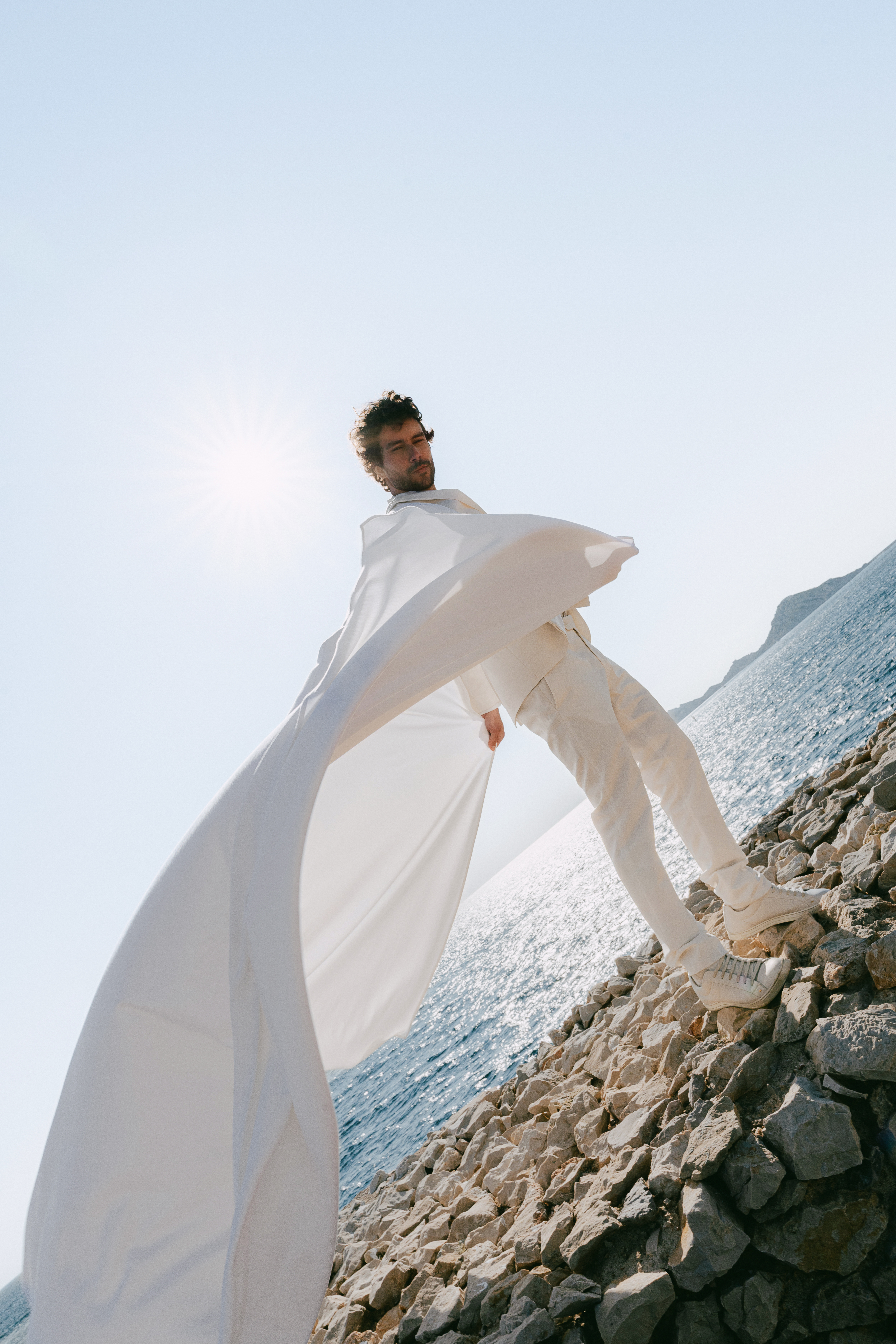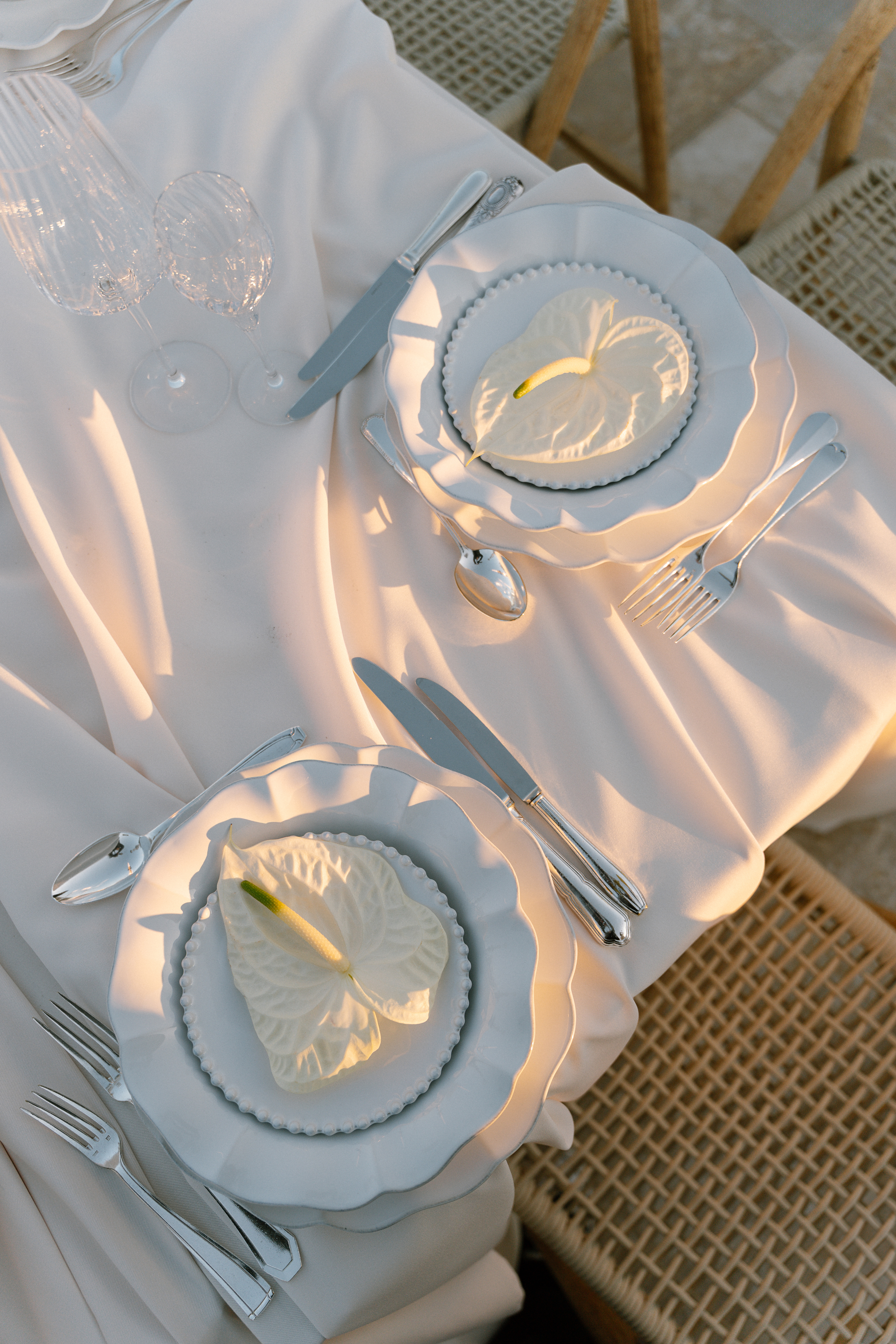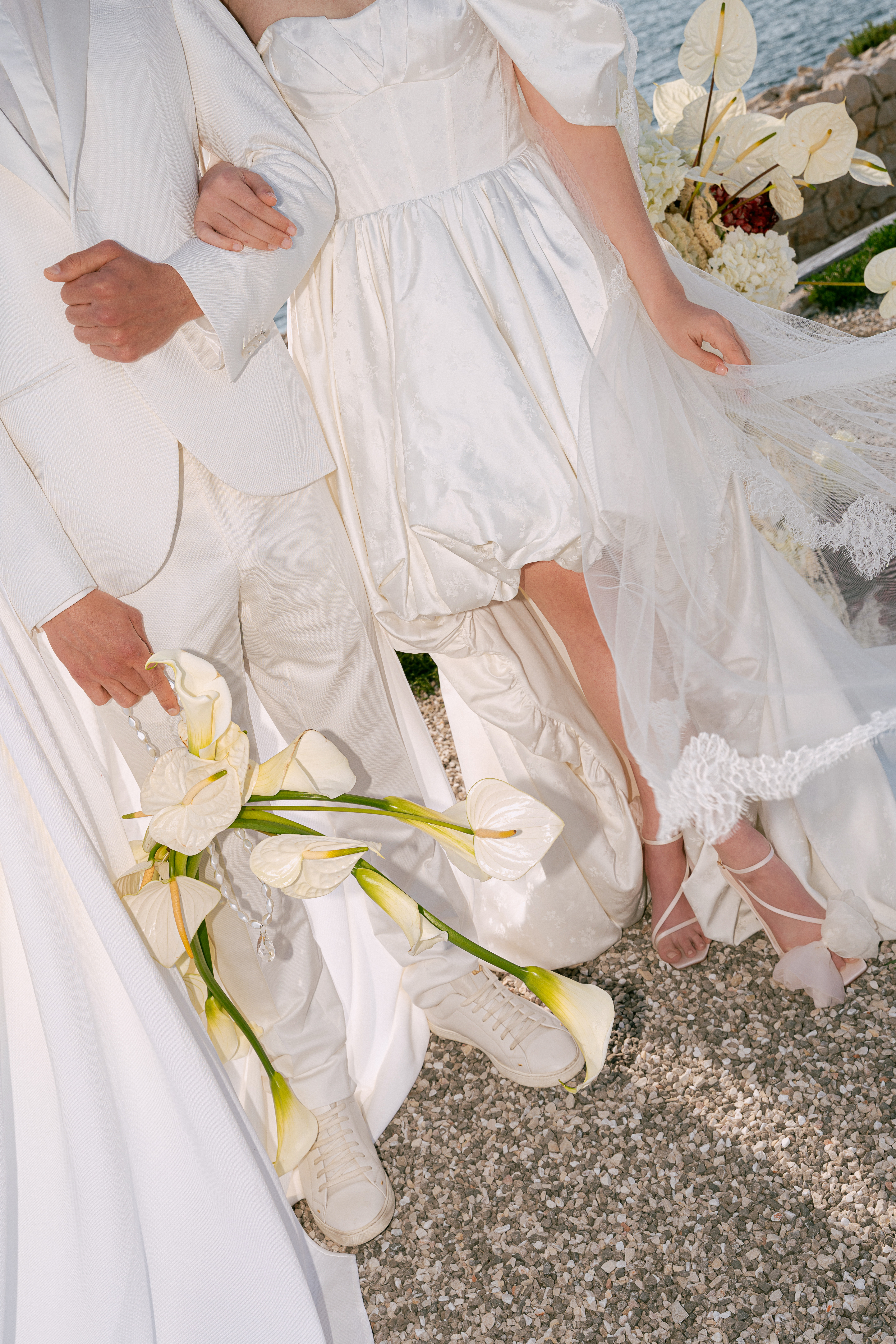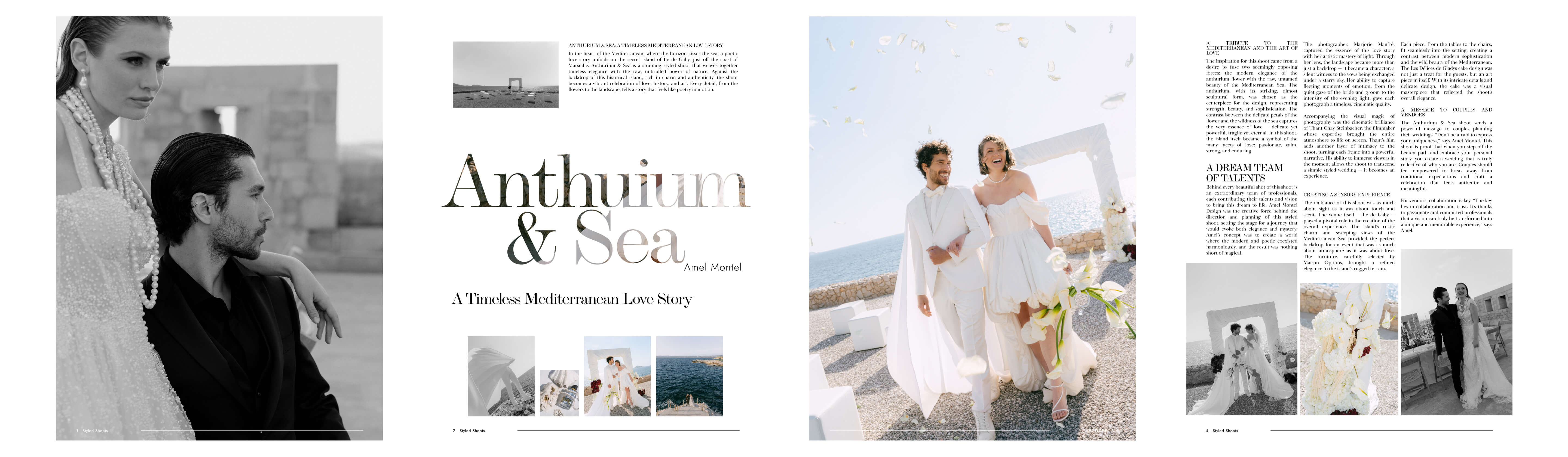 The inspiration for this shoot came from a desire to fuse two seemingly opposing forces: the modern elegance of the anthurium flower with the raw, untamed beauty of the Mediterranean Sea. The anthurium, with its striking, almost sculptural form, was chosen as the centerpiece for the design, representing strength, beauty, and sophistication. The contrast between the delicate petals of the flower and the wildness of the sea captures the very essence of love — delicate yet powerful, fragile yet eternal. In this shoot, the island itself became a symbol of the many facets of love: passionate, calm, strong, and enduring.