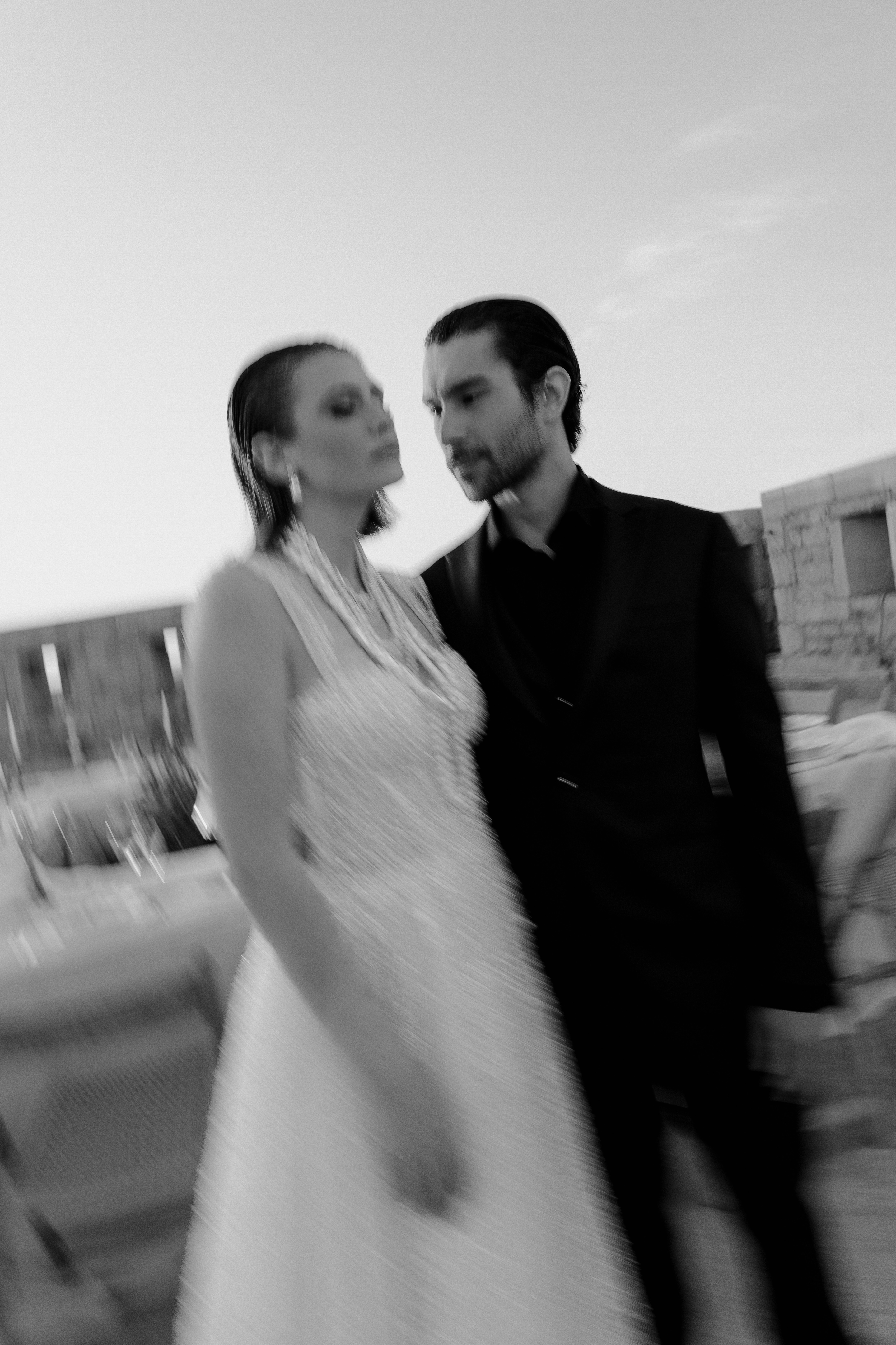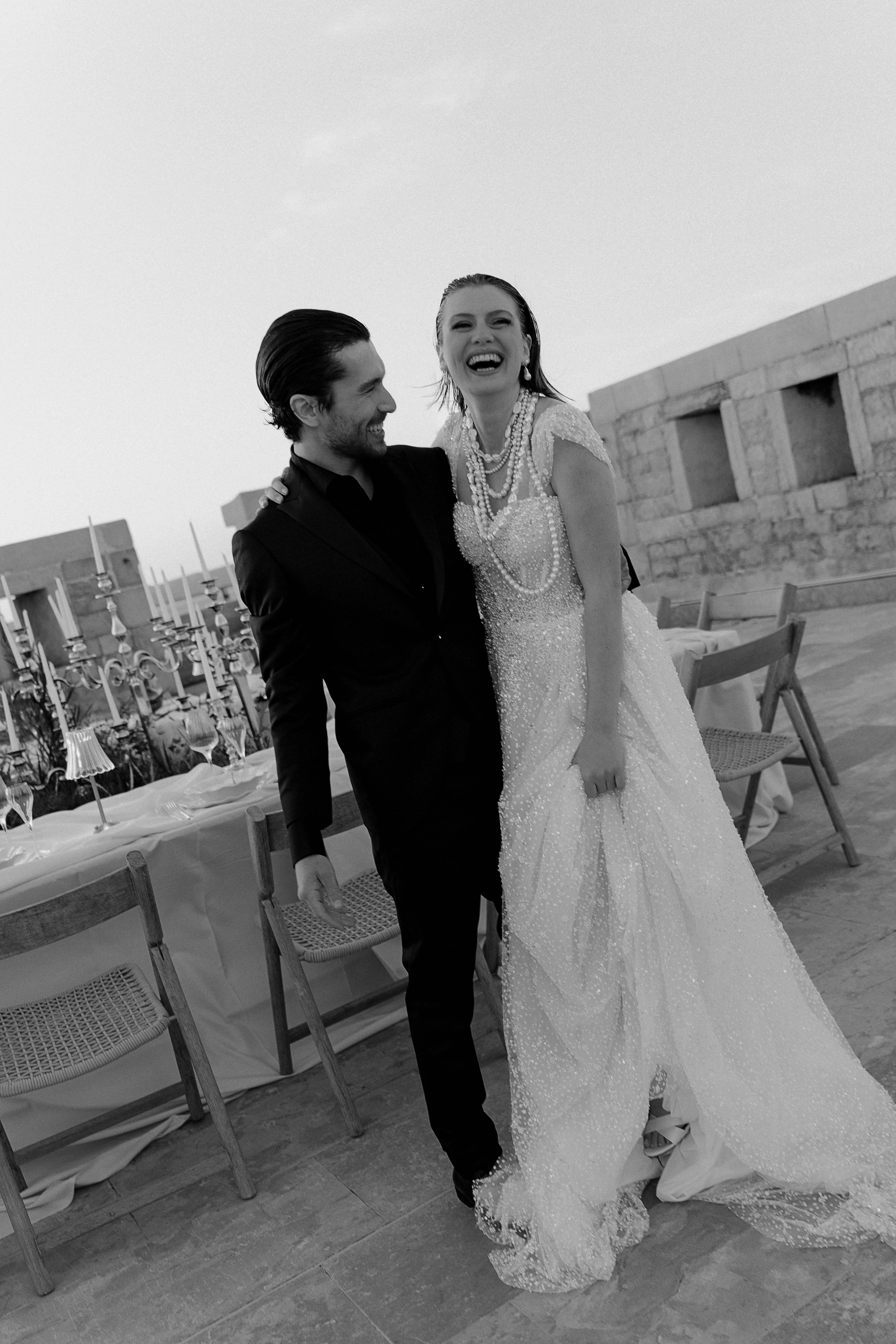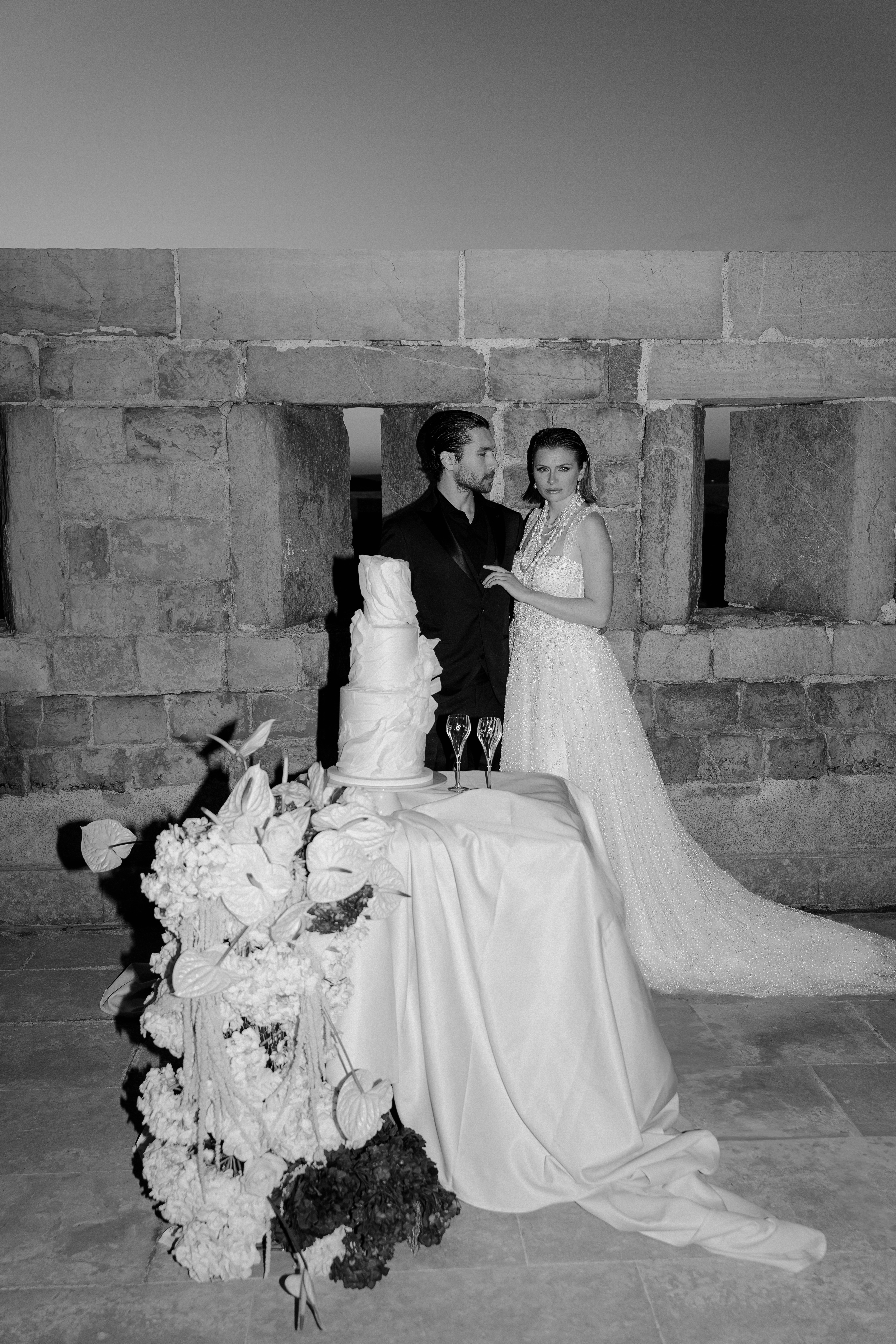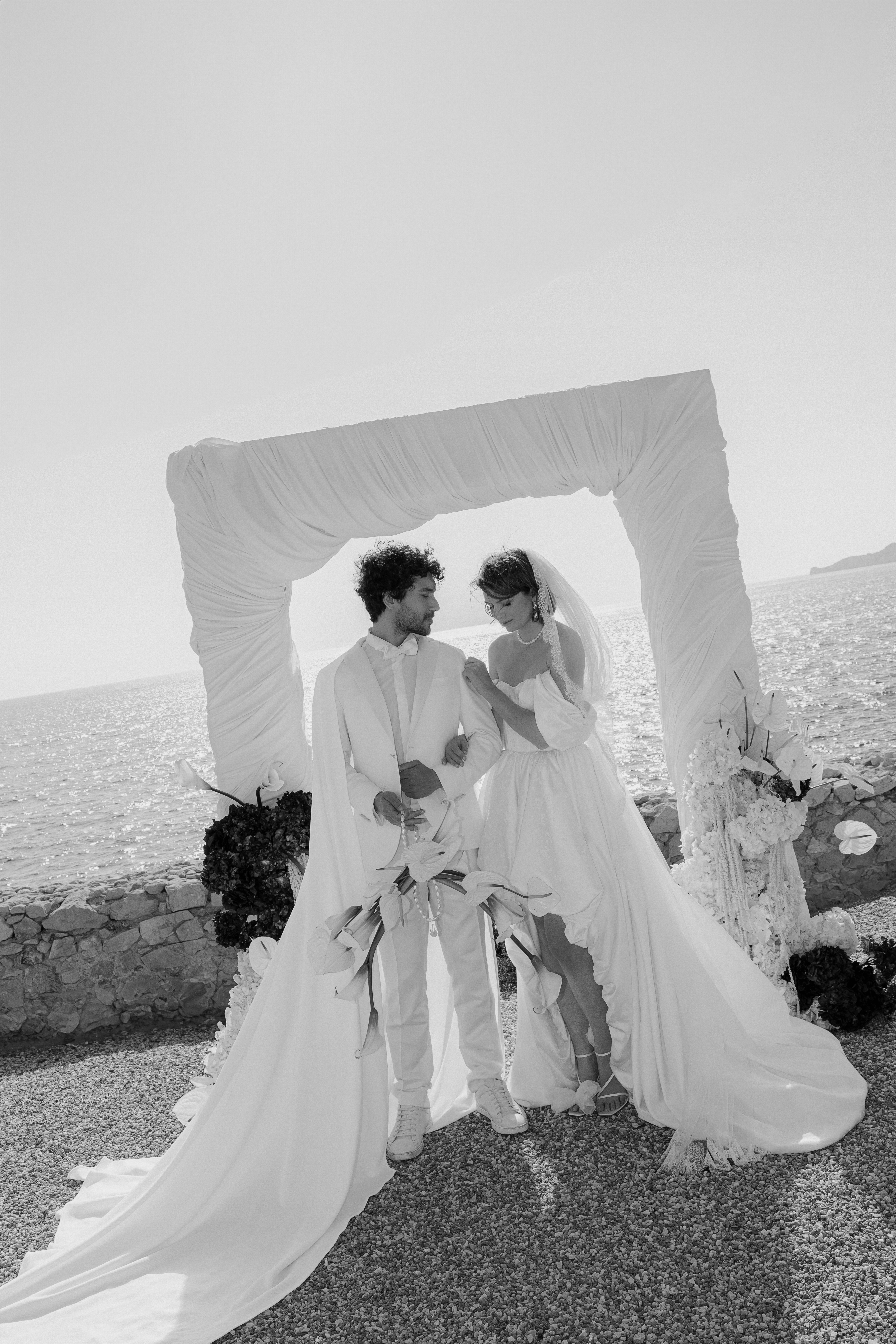 For the bride and groom, fashion was central to the shoot’s narrative. The bride, draped in Rime Arodaky’s beautiful gown, embodied modern bridal elegance. Her dress, with its fluid lines and romantic flair, captured the ethereal beauty of a timeless love story. Sonia B. Marseille’s evening gown mirrored the soft power of the island itself, its structure representing strength and grace, a perfect complement to the bride’s character. Espace Homme Cérémonie dressed the groom in a sharply tailored suit, his sophisticated look exuding confidence and elegance, making him the perfect counterpart to the bride’s beauty.