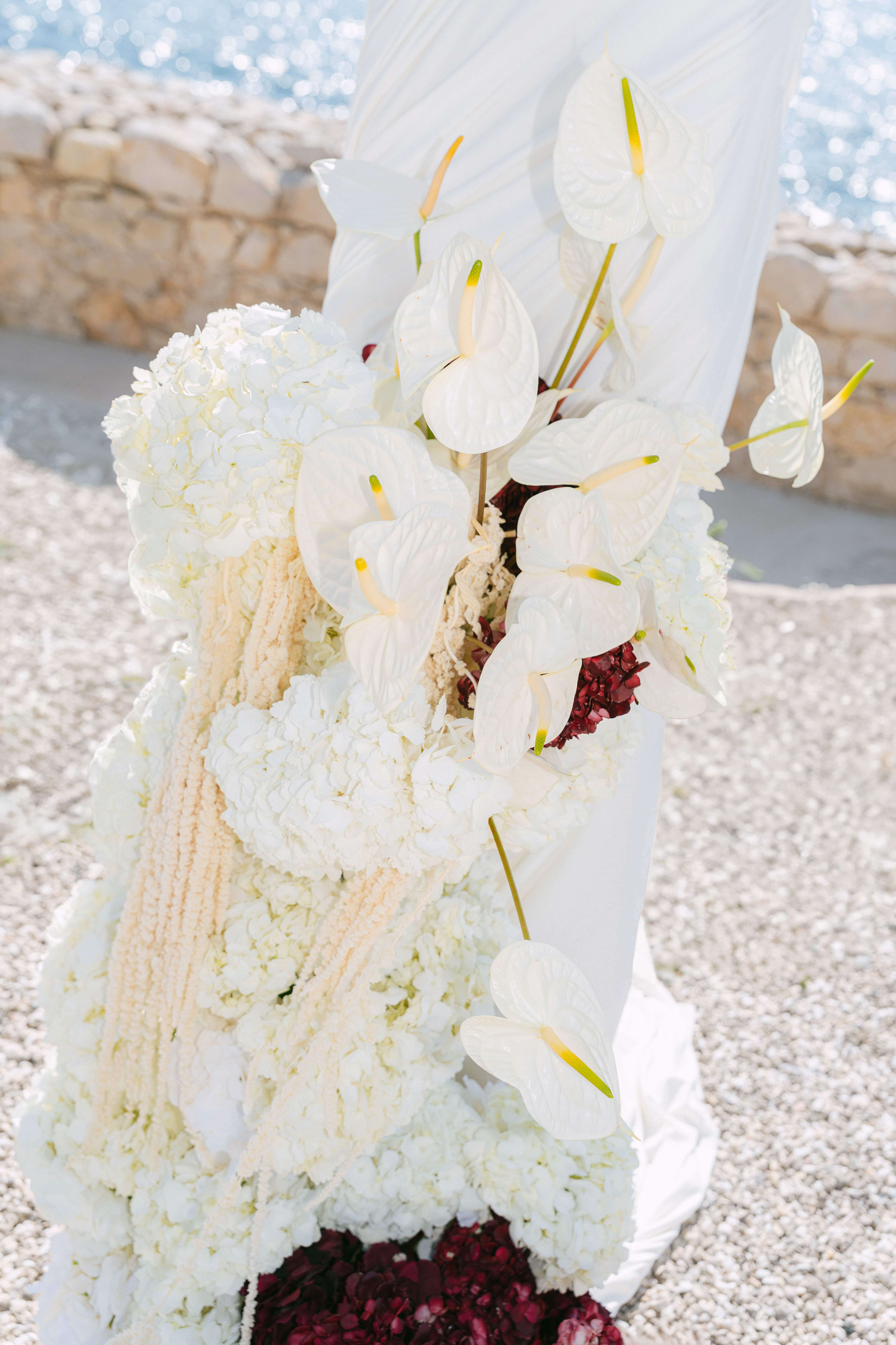 The combination of flowers, natural elements, and the rugged beauty of the Mediterranean coastline created a perfect setting for this romantic vision. The anthurium, paired with bright roses, their sweet fragrance filling the air, represented the delicate balance between elegance and nature’s wild spirit — an apt metaphor for the intimacy of a wedding, where love blooms in every form.
