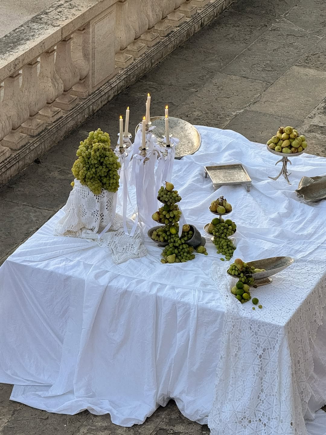 Green fruits are the unsung heroes of autumn styling. Grapes, pears, figs, and plums add shape, texture, and a sense of generosity to the table. Instead of hiding them in bowls, let them cascade over lace, pile them into silver dishes, or tie individual fruits with silk ribbons for a whimsical favor. It’s practical, edible, and endlessly stylish.