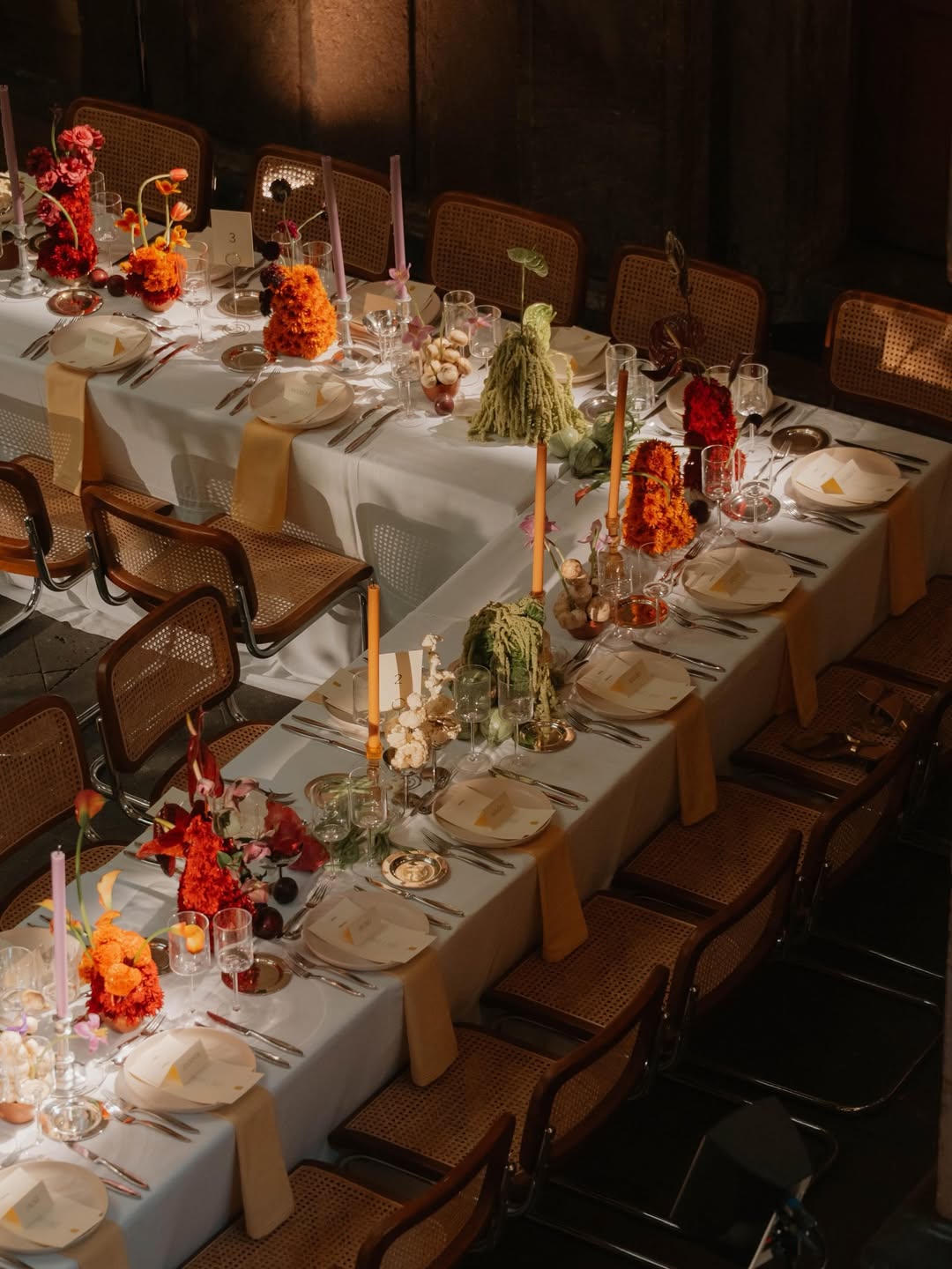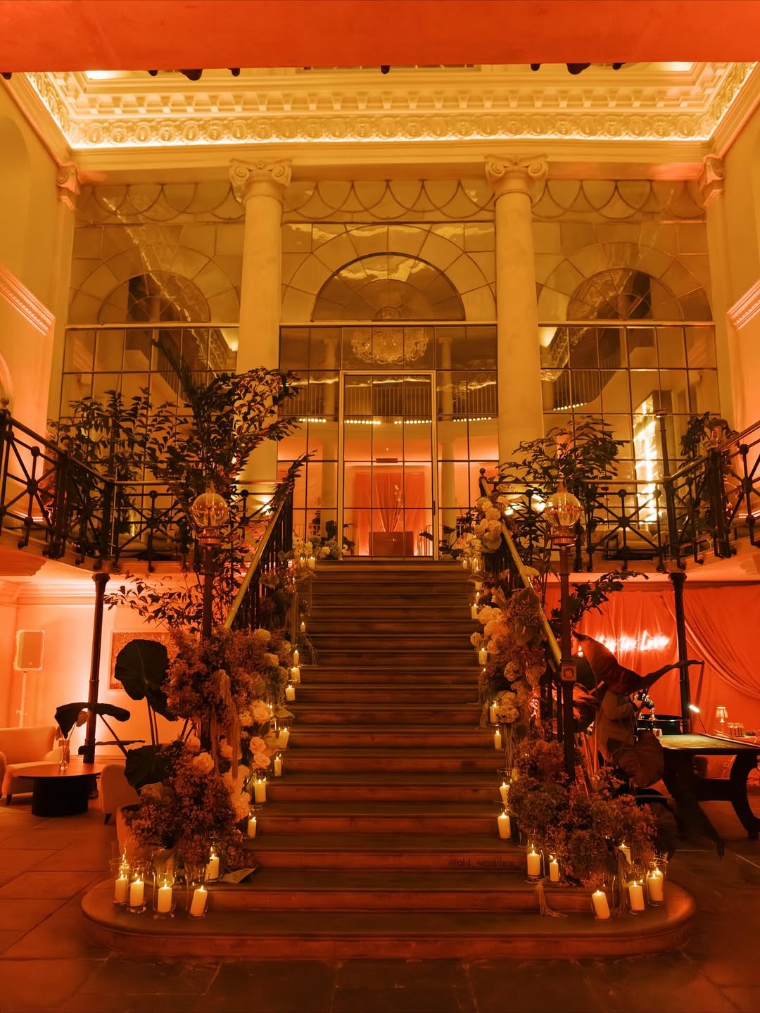 Warm light is especially striking in architectural venues. The staircase lined with candles creates a dramatic entrance, while the amber uplighting highlights every arch and column with a golden sheen. It’s not just functional lighting—it’s storytelling with warmth.