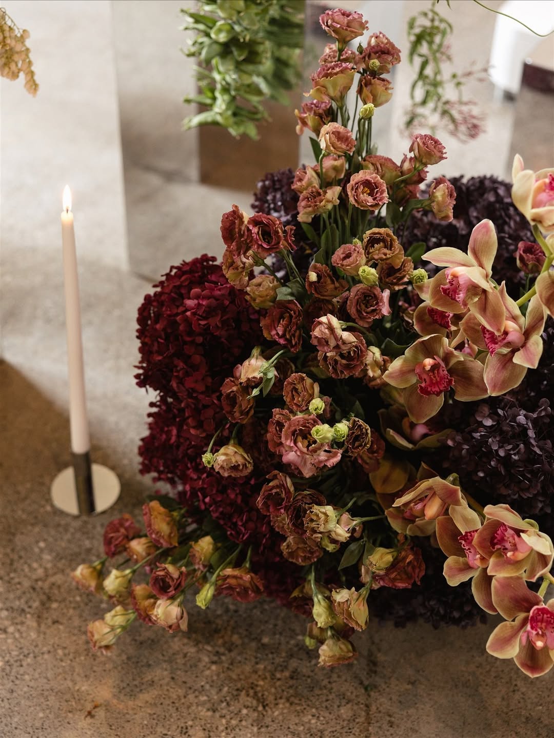 - Florals: Choose blooms like dahlias, ranunculus, and peonies in deep wine and plum shades. Pair them with textural elements such as amaranth or dark foliage. The goal is drama, not delicacy.