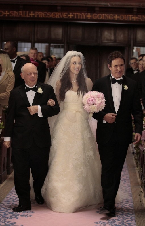 First, there’s Blair Waldorf, the original queen of couture. She walked down the aisle in a soft blush Elie Saab Haute Couture gown, dripping in floral embroidery and tiny sequins that caught the light like champagne fizz. It wasn’t a “princess” dress — it was refined, powerful, and very Blair. The romantic veil softened the look, but make no mistake, this was luxury with a side of attitude.
