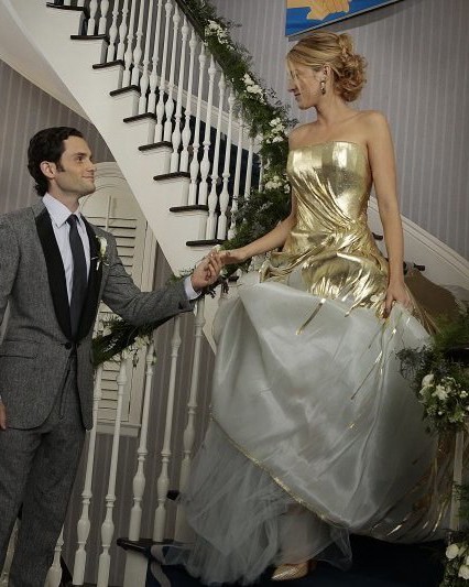 And then came Serena van der Woodsen, turning every rule of bridal fashion on its head. Her metallic gold and white Georges Chakra gown looked like it was spun from sunlight. The strapless bodice, sculptural layers, and bold shine screamed main-character energy — effortlessly glamorous, unapologetically extra. Only Serena could make a gold wedding dress feel natural.
