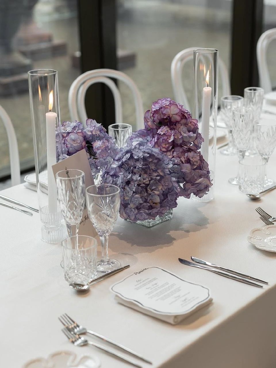 The tables are where your guests will spend most of their time, so let’s make them magical. Lavender wedding table ideas include soft-hued tablecloths or runners, lavender-dyed napkins, and place settings topped with a sprig of lavender or a personalized tag. Pair these with candlelight, delicate glassware, and floral accents in coordinating shades. Lavender wedding centerpiece ideas can range from rustic jars filled with wildflowers and lavender to tall, elegant arrangements surrounded by votives. These elements bring texture, depth, and fragrance to your reception tables.