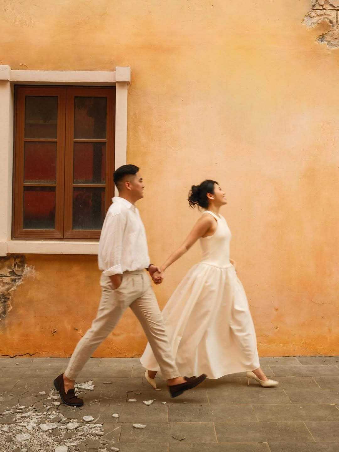 All-white or cream outfits give photos a dreamy, ethereal look. Pair a white dress with linen pants and a matching shirt for balance. Mix textures—crisp white, soft cream, matte cotton, shimmering silk. These looks work best on beaches, in white studios, modern buildings, or open fields. Choose natural makeup and simple hair. This style shines at outdoor pre-wedding photoshoots with airy, luminous settings.
