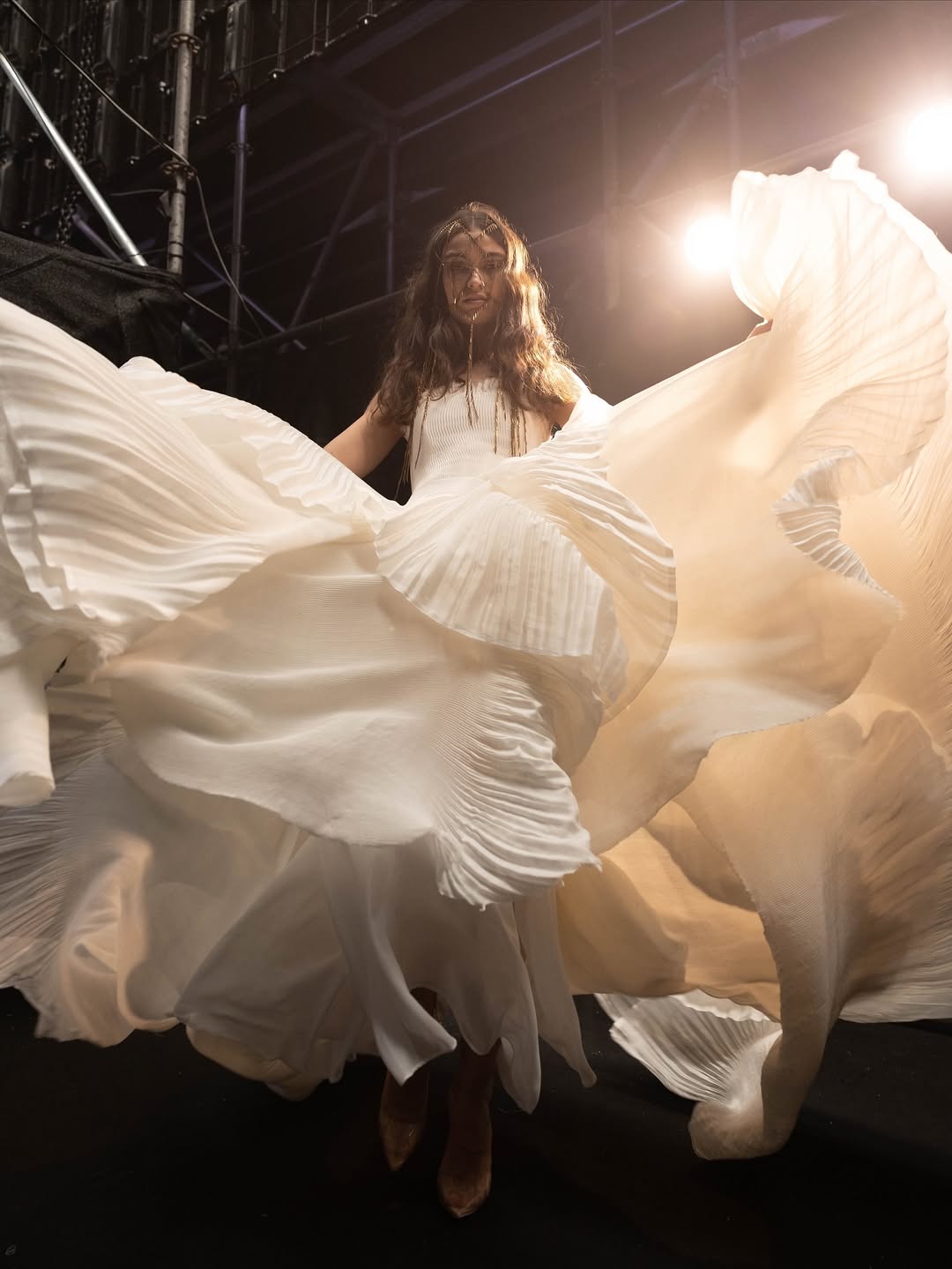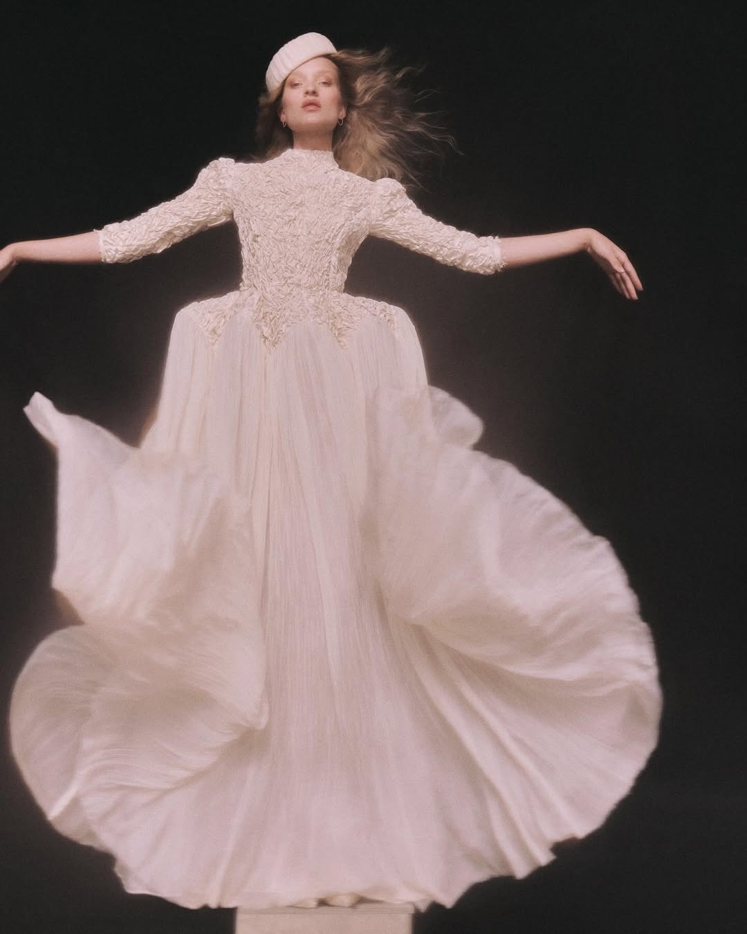 Layering in bridal fashion has moved beyond soft, romantic. Editorial shoots now often use several layers of transparent fabrics, each one catching the light in its own way and creating depth by overlapping. Designers also take volume to new heights, with sleeves that fill the whole frame, trains that stretch across the scene, and veils that create entire environments instead of just being accessories.