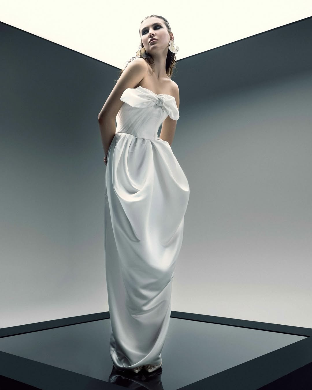 Sculptural bridal silhouettes are popular in high-fashion editorials because they appear as shapes rather than just decorations in photos. Picture structured bodices making bold horizontal lines, or skirts so voluminous they look like architectural pieces. These dresses do not simply make the body look pretty; they turn it into something geometric, unusual, and striking. The magazine’s photos use a minimalist style, but it’s not soft or romantic. Instead, the clean lines stand out, and the simple color schemes make you notice texture and shadow. The sharp silhouettes almost look severe. Draping turns sculptural as it gathers and shapes the image. A sleeve is more than fabric on an arm; it becomes a cascade that leads your eye down, forming a vertical line in the photo. Editorial high-fashion bridal photography finds drama in simplicity. A single fold of fabric can be as striking as a bouquet. The empty space around the bride’s outline matters just as much as the shape itself. Every detail supports the overall form, the lines, and the balance between solid and empty space.