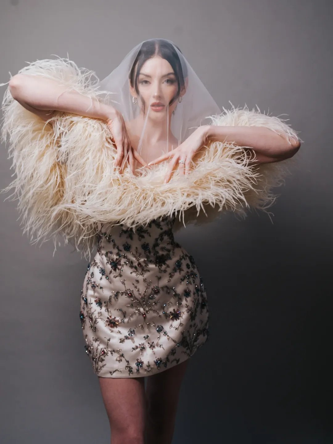 Dresses with sculptural shapes call for creative design, even without a couture budget. In this bridal editorial, the dress choices focus on bold, architectural details instead of traditional beauty. You’ll see asymmetry, unusual proportions, and construction details that stand out in photos. Some bodices are tightly corseted, creating dramatic hourglass shapes that almost look exaggerated. Skirts may be flat in front and full in back, making side views look like fashion sketches brought to life. Here, fabric is treated like a sculptor’s material: Mikado silk holds sharp folds, organza is layered until it turns opaque, and crepe hugs the body to show off its shape. The construction is meant to be seen and appreciated. Boning adds structure, seams are placed for visual effect, and draping is left unfinished on purpose, because the process is just as interesting as the final look.