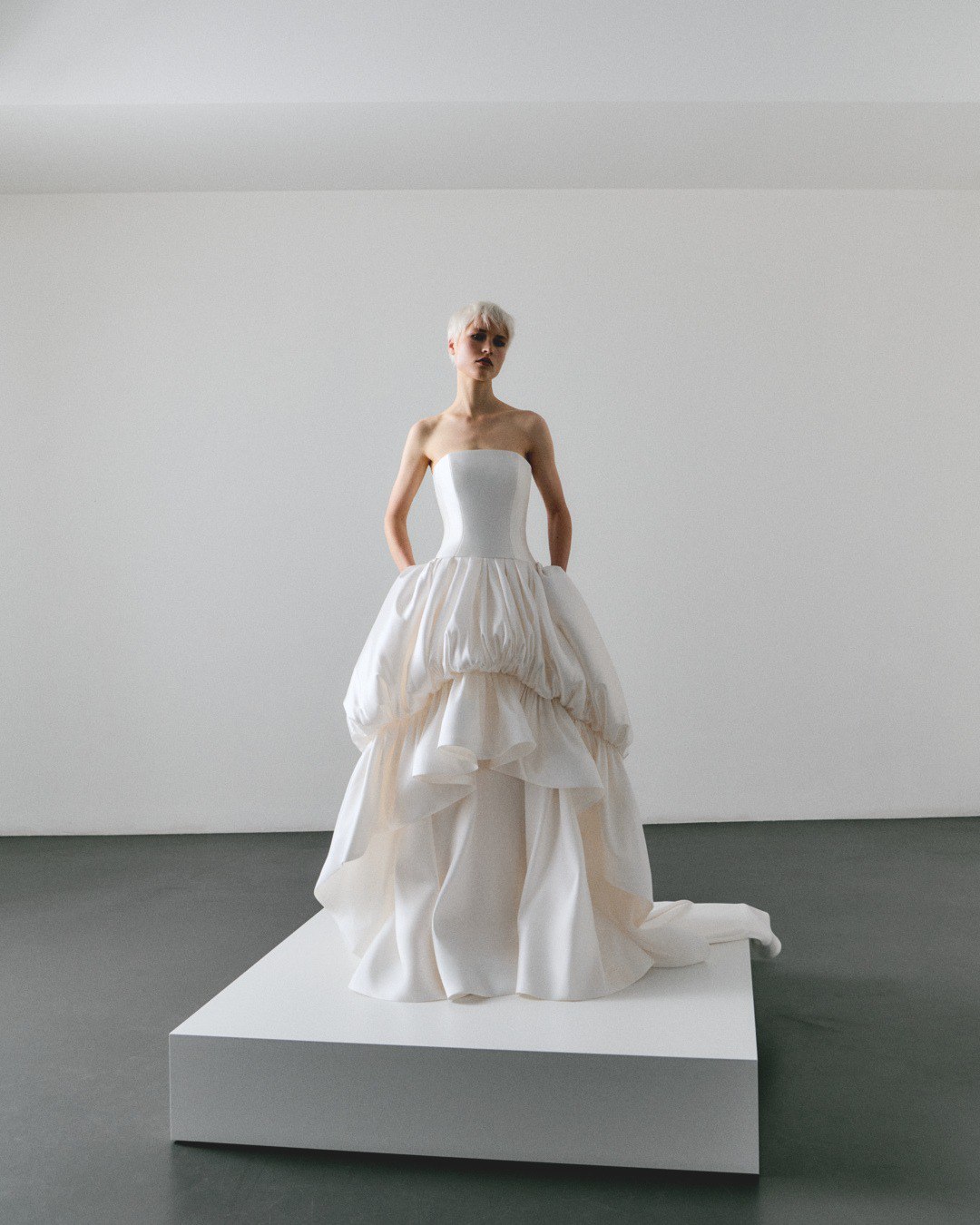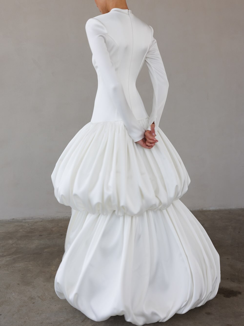 These gowns are ahead of the trend because they do not stick to the usual styles. A top might have tight folds that suddenly spread out into a big, gathered shape at the hip. A skirt might look smooth from the front, but from the side, you can see layers of shaped folds. This puffy bridal dress style is great for brides with an artistic sensibility and who see fashion as art. It is perfect for those who want their gown to showcase both skill and beauty. The way these gowns move is striking – the shaped folds add weight and movement, making every turn dramatic and every step look meaningful and eye-catching.