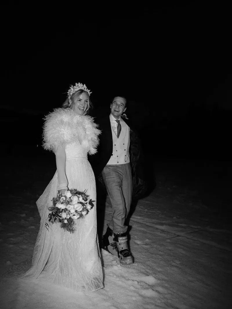 Bridal dresses for weddings in the French Alps need to be both beautiful and practical. Heavy ball gowns with long trains are impractical outdoors — trains drag through the snow, the volume restricts movement, and the fabric shows every speck. Lightweight A-line or sheath silhouettes made from silk, crepe, or chiffon are a better option. If you're spending a lot of time outdoors, consider tea-length or midi dresses — they photograph beautifully and won't get ruined by the elements. For winter weddings, think layers and warmth. Opt for long sleeves, thicker fabrics, and gorgeous coats, capes, or fur wraps that complement the overall look. White cashmere coats, vintage fur stoles, or custom capes will keep you both warm and beautiful. Elegant leather boots or tasteful snow boots are a better option for outdoor photos than navigating ice in heels.