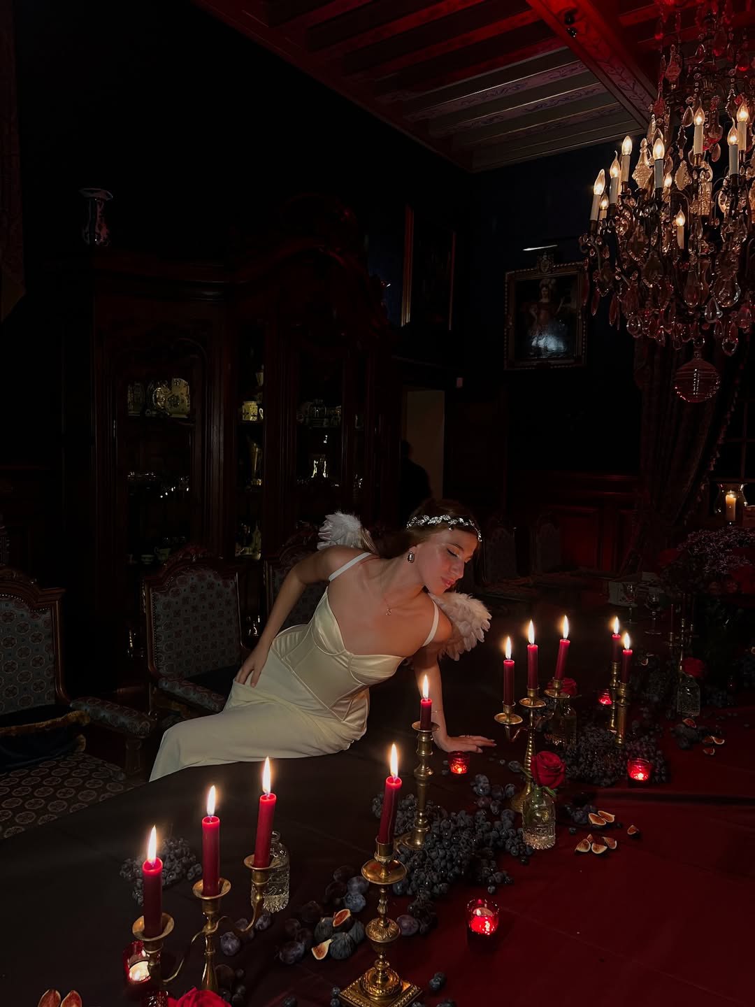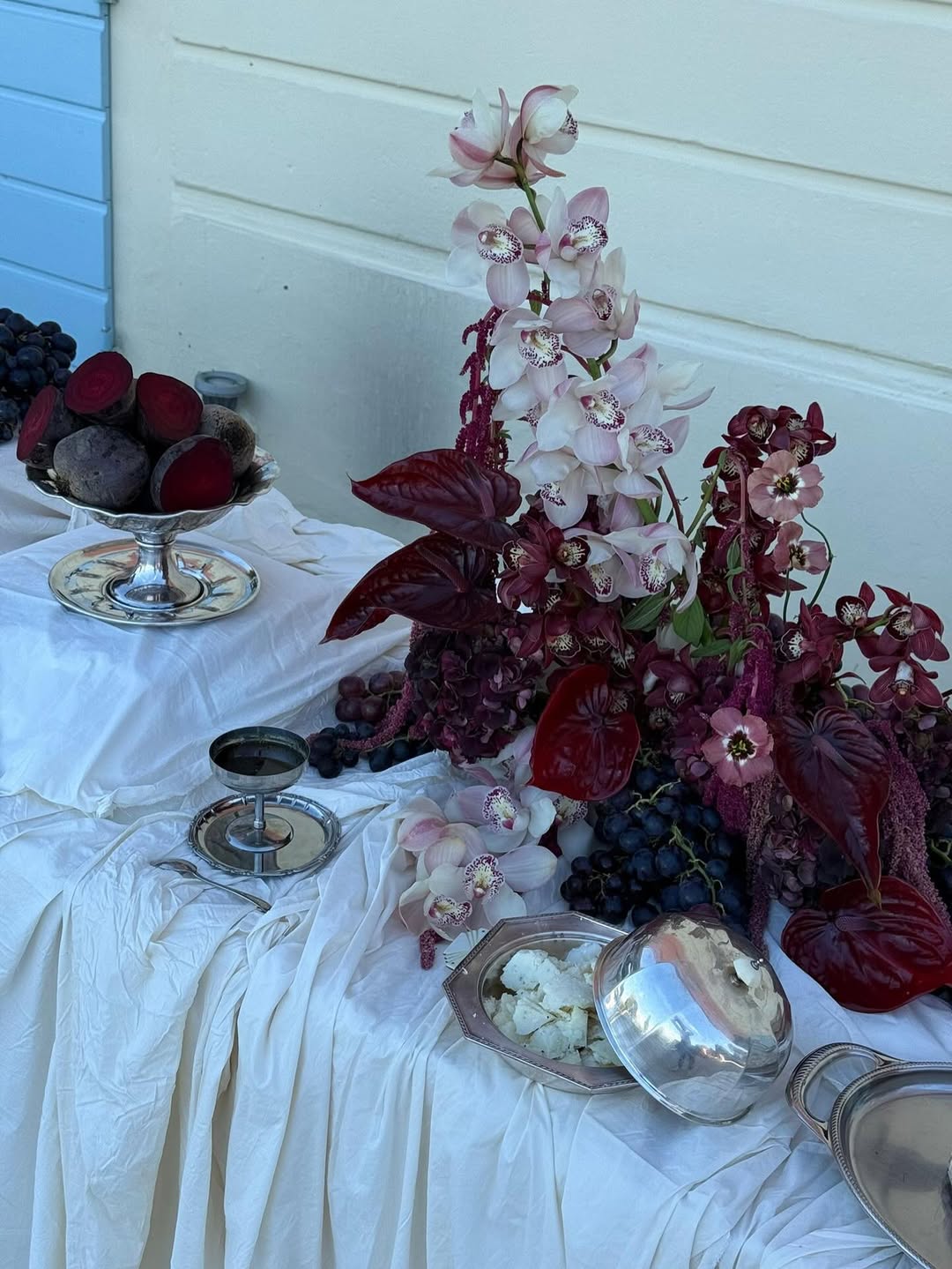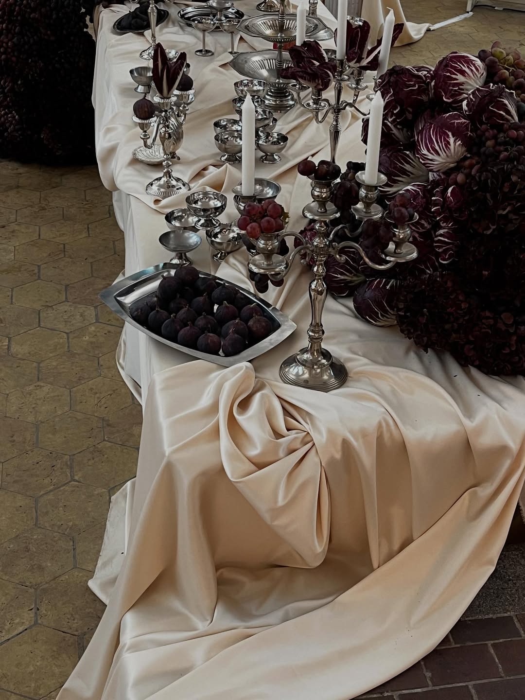 Start with your centerpieces: think beyond basic florals and layer in artichokes, heirloom tomatoes, figs, or clusters of grapes spilling across the table like a Renaissance painting. We love mixing deep jewel-toned vegetables—think purple cabbage, burgundy radicchio, or glossy aubergines—with unexpected fruits like kumquats, blood oranges, or even dragon fruit for a pop of electric pink.