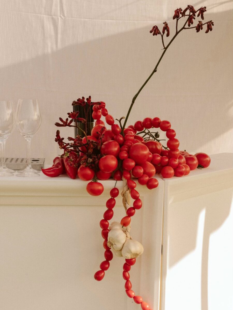 If you want a bold, editorial look that guests will talk about long after your wedding, bring fruits and vegetables into your ceremony arches and photo zones. This is where you can really lean into drama and creativity. The beauty of produce is that it can be styled like cascading floral arrangements — only with unexpected texture and color.