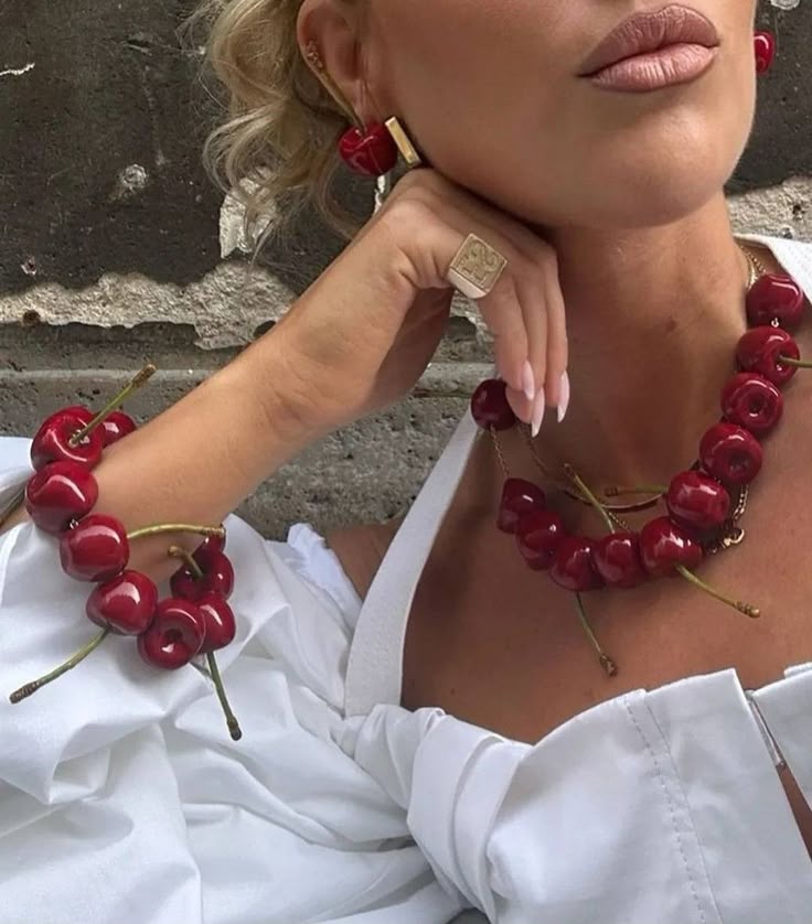Why not make your jewelry part of the story? Cherry bracelets and earrings can double as playful statement pieces for a pre-wedding look or even for an after-party change. They add a sense of fun, freshness, and fashion that’s impossible to ignore. For brides who want their style to be talked about, edible-inspired jewelry is bold, photogenic, and unforgettable.
