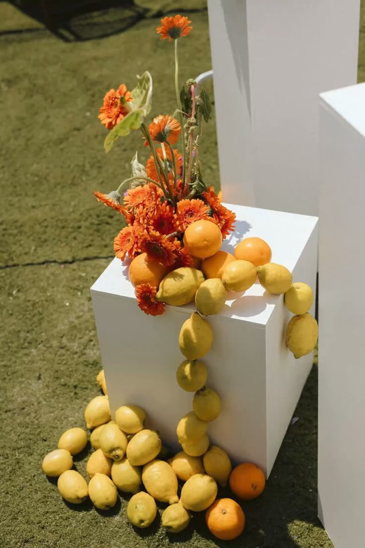 - Citrus Dreams: Create a backdrop of lemons, oranges, and grapefruits, either stacked in clusters or sliced into vibrant patterns. Perfect for coastal or summer weddings.