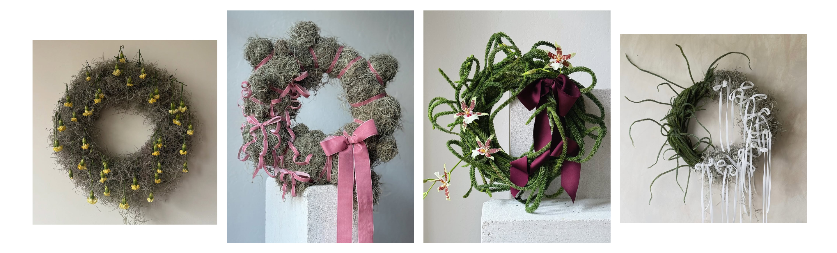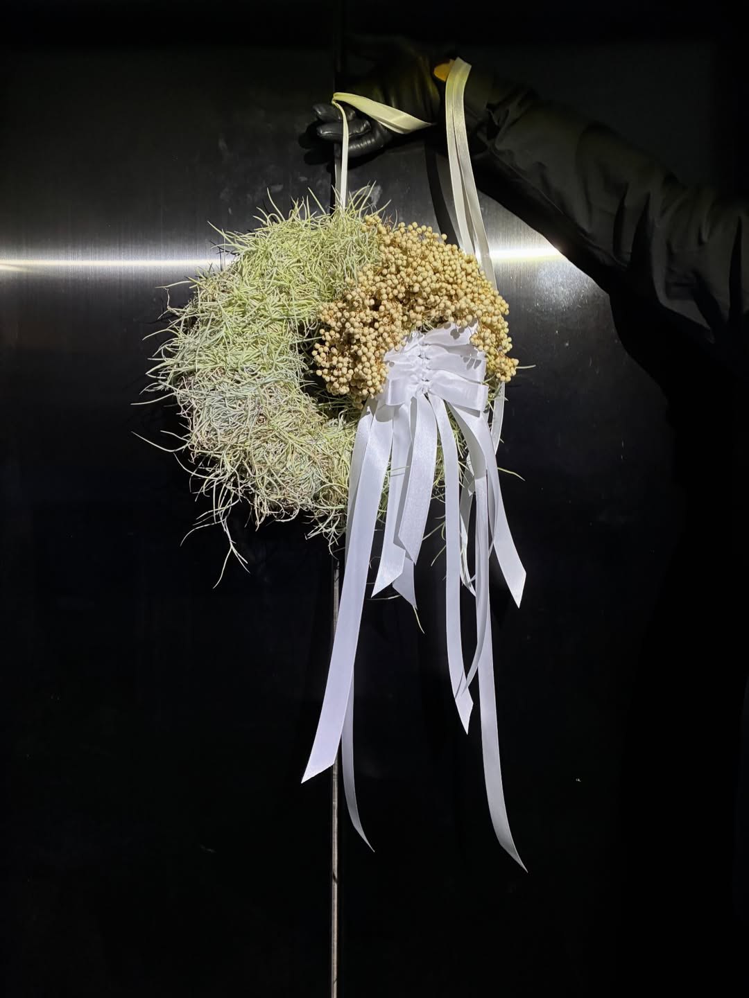 Today’s wedding wreath centerpieces often feature asymmetry and imperfection, using grass, moss, and a mix of natural textures. Instead of being perfectly round and dense, these wreaths are loose and organic, giving them a modern feel. Designers use preserved moss bases, dried grasses of varying heights, and unique touches such as lichen or air plants. When paired with just a few flowers, these materials create a sophisticated, gallery-inspired look. Their natural irregularity makes them special—each one is a little different, truly handmade, and impossible to copy exactly.
