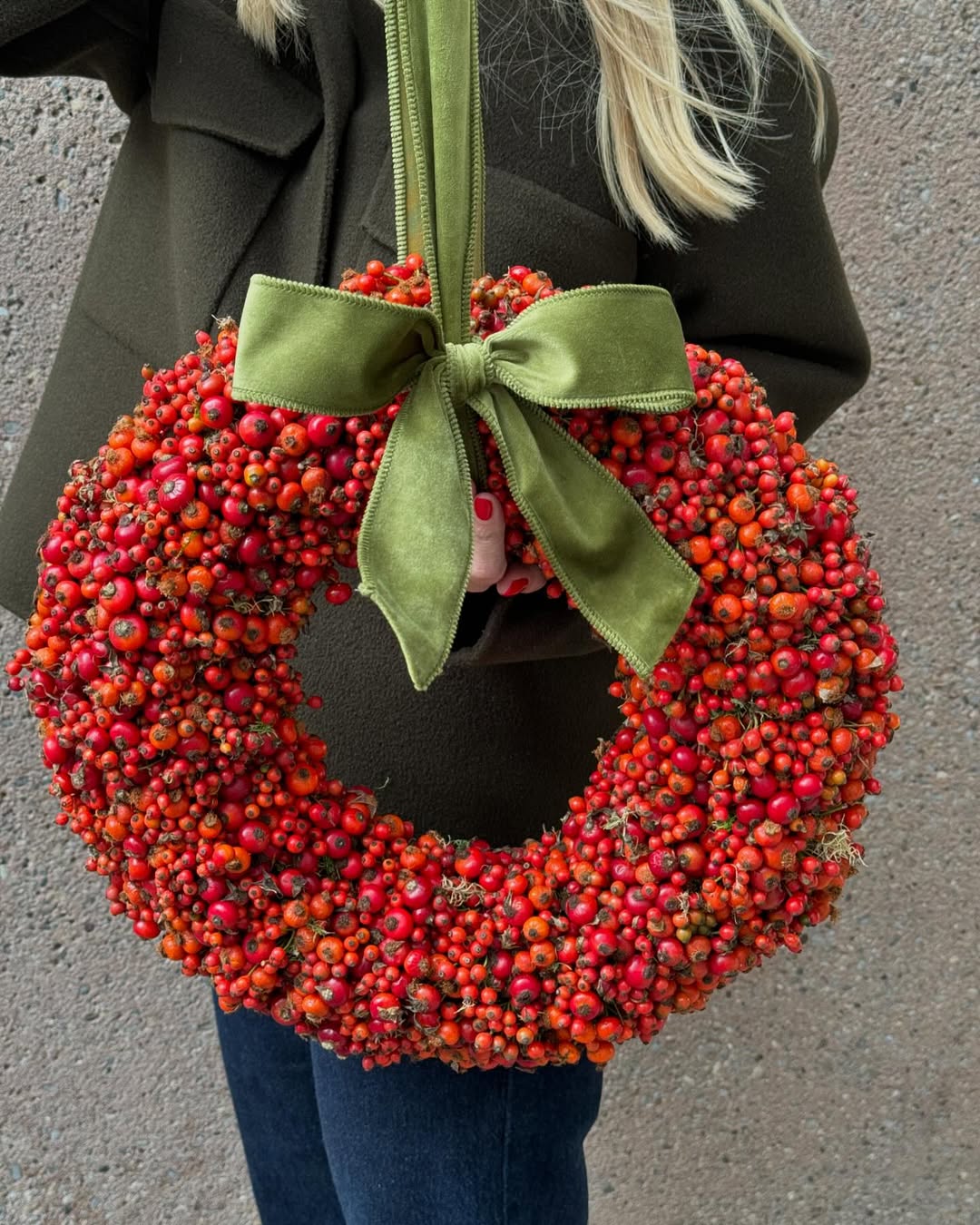 Berries add color, drama, and a seasonal feel to wedding wreath centerpieces, making them perfect for autumn and winter events. Deep burgundy hypericum, orange rosehips, and dark blue berries bring rich, jewel-like tones that look beautiful in photos. Wreath centerpieces with berries work well for long tables, where their colors create a sense of rhythm and flow. For entrances, berry-filled wreaths give a warm, abundant welcome and invite guests to celebrate.