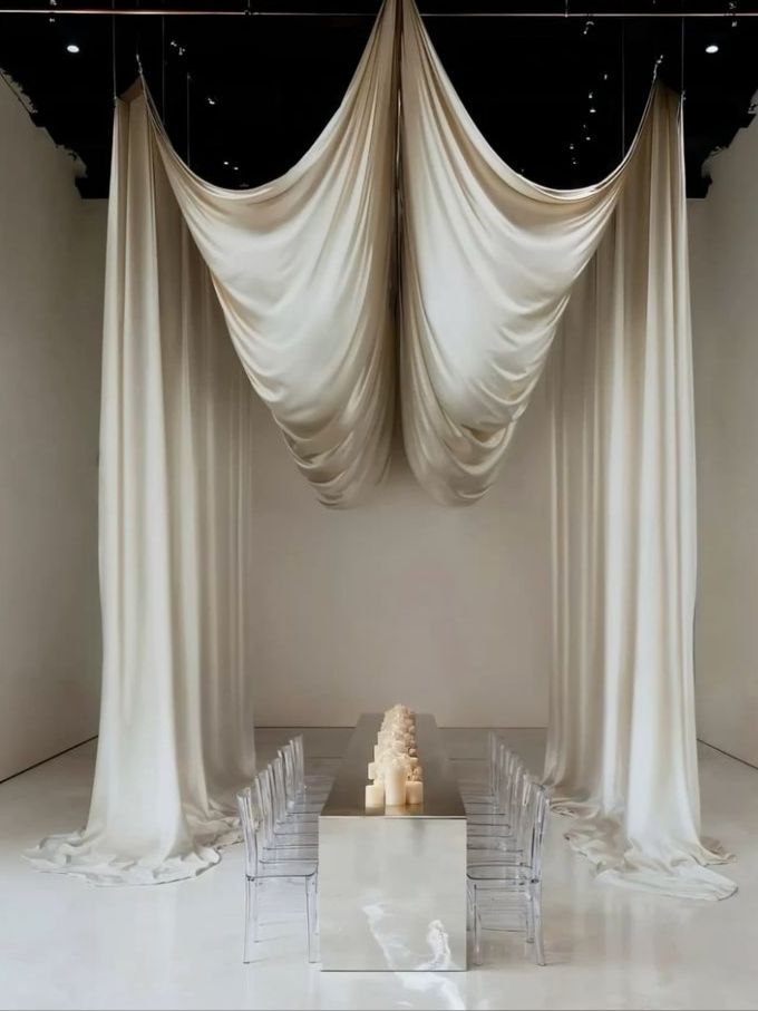 Here's where it gets really fun: you can manipulate fabric to create architectural elements that don't actually exist. Hang different lengths of fabric from your ceiling to create the illusion of height and movement. Drape fabric in swags across walls to create visual interest and depth. Use fabric panels to section off different areas of your venue – maybe create a cozy cocktail nook or frame your dessert table.