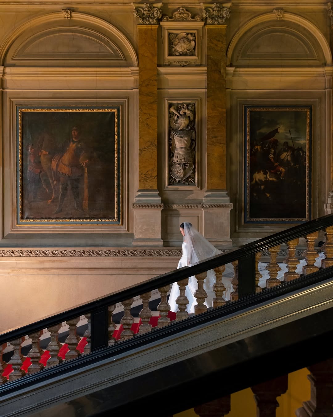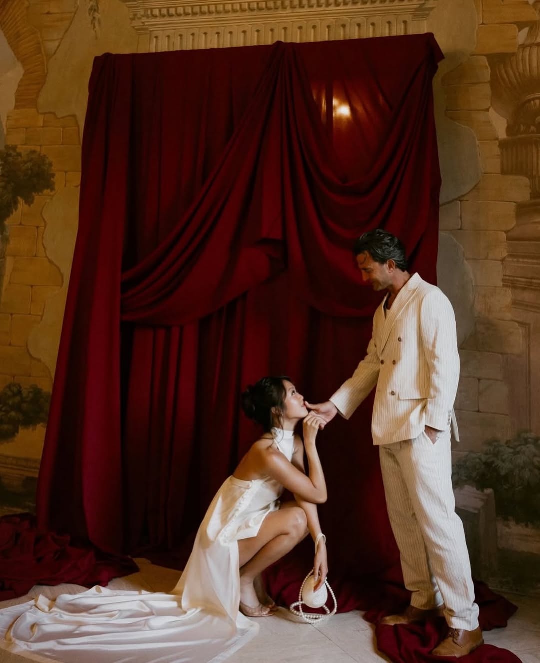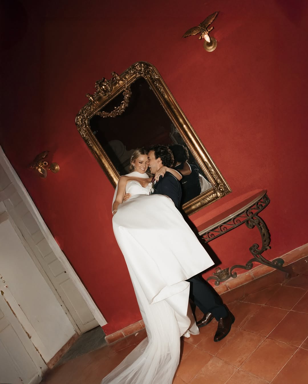 Symmetry is especially effective in indoor wedding photoshoots. A centered composition, a couple perfectly positioned within a doorway, standing on the axis of a symmetrical hallway, creates a formal elegance difficult to achieve outdoors. The limited space allows for precise positioning of subjects: they can be placed where architectural lines converge, where the light falls most effectively, and where the geometry of the space serves rather than contradicts the image.