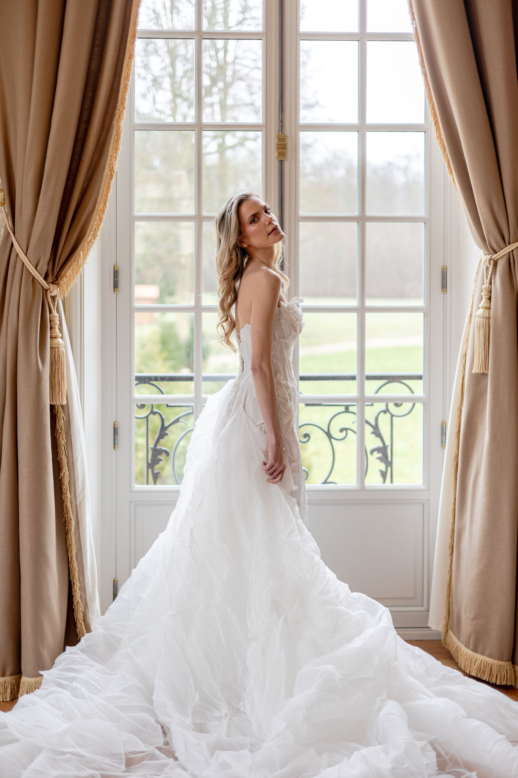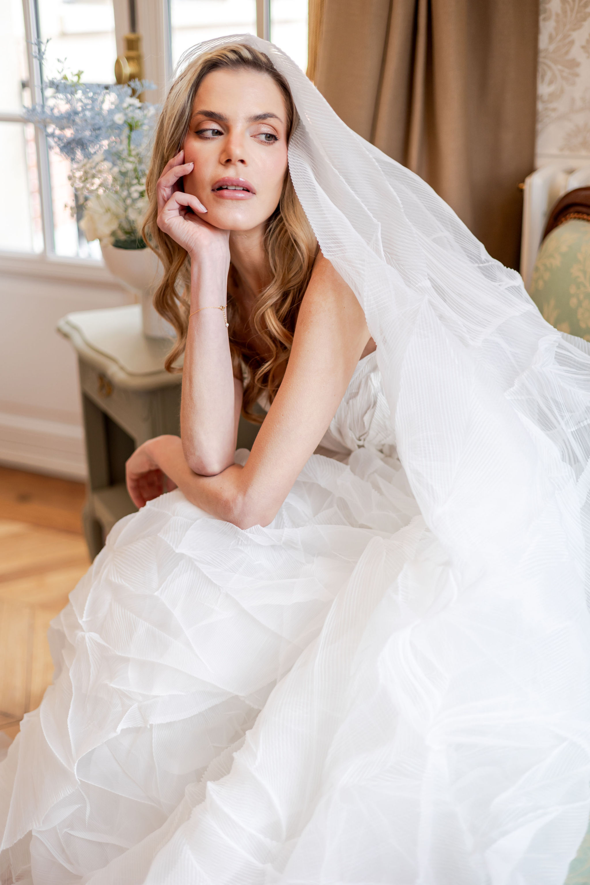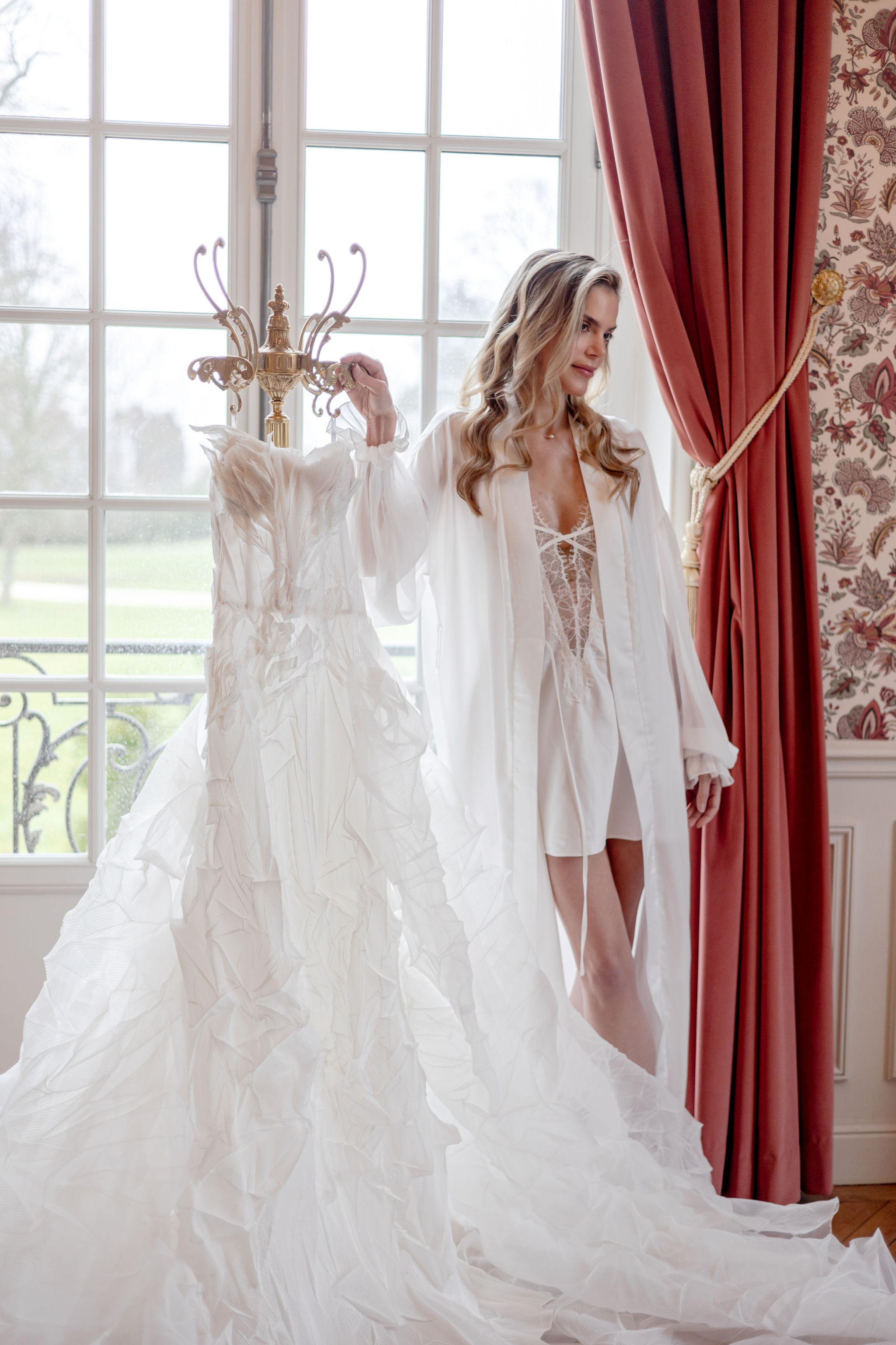 The gowns, sourced through The Bride Paris and designed by Lana Marinenko, explored two complementary expressions of modern femininity. The first look brought clean architecture and controlled movement — a silhouette that felt strong yet weightless, proving that restraint can be deeply seductive when the cut is right. The second gown, by Womanze, shifted the mood into something softer and more intimate. It did not change the story so much as lower its voice, creating a second chapter that felt closer, quieter, and more personal.