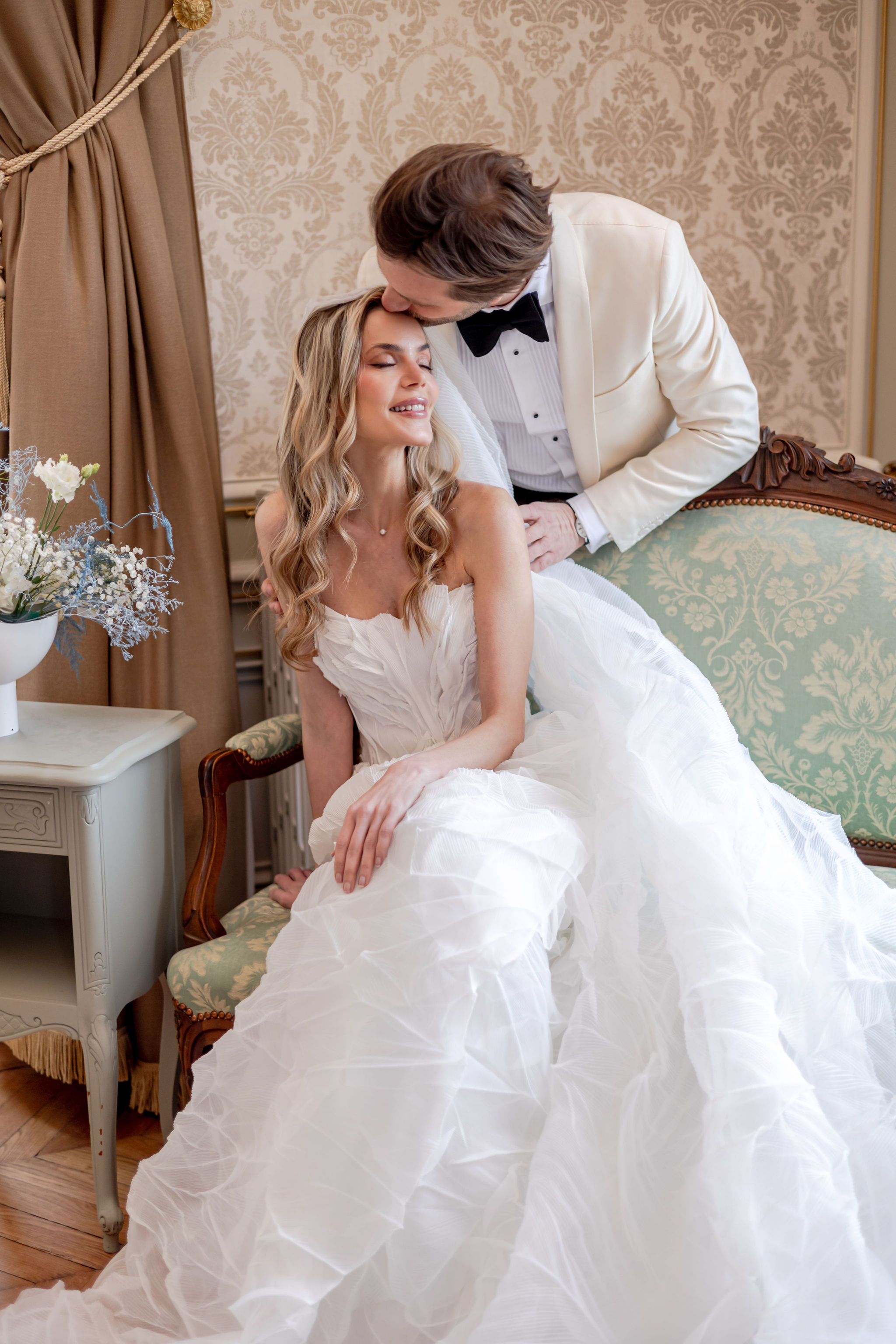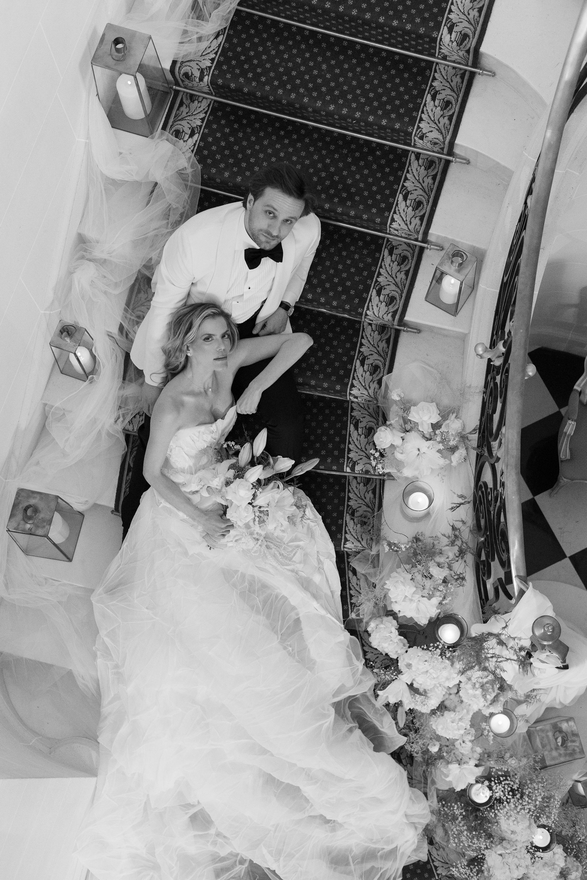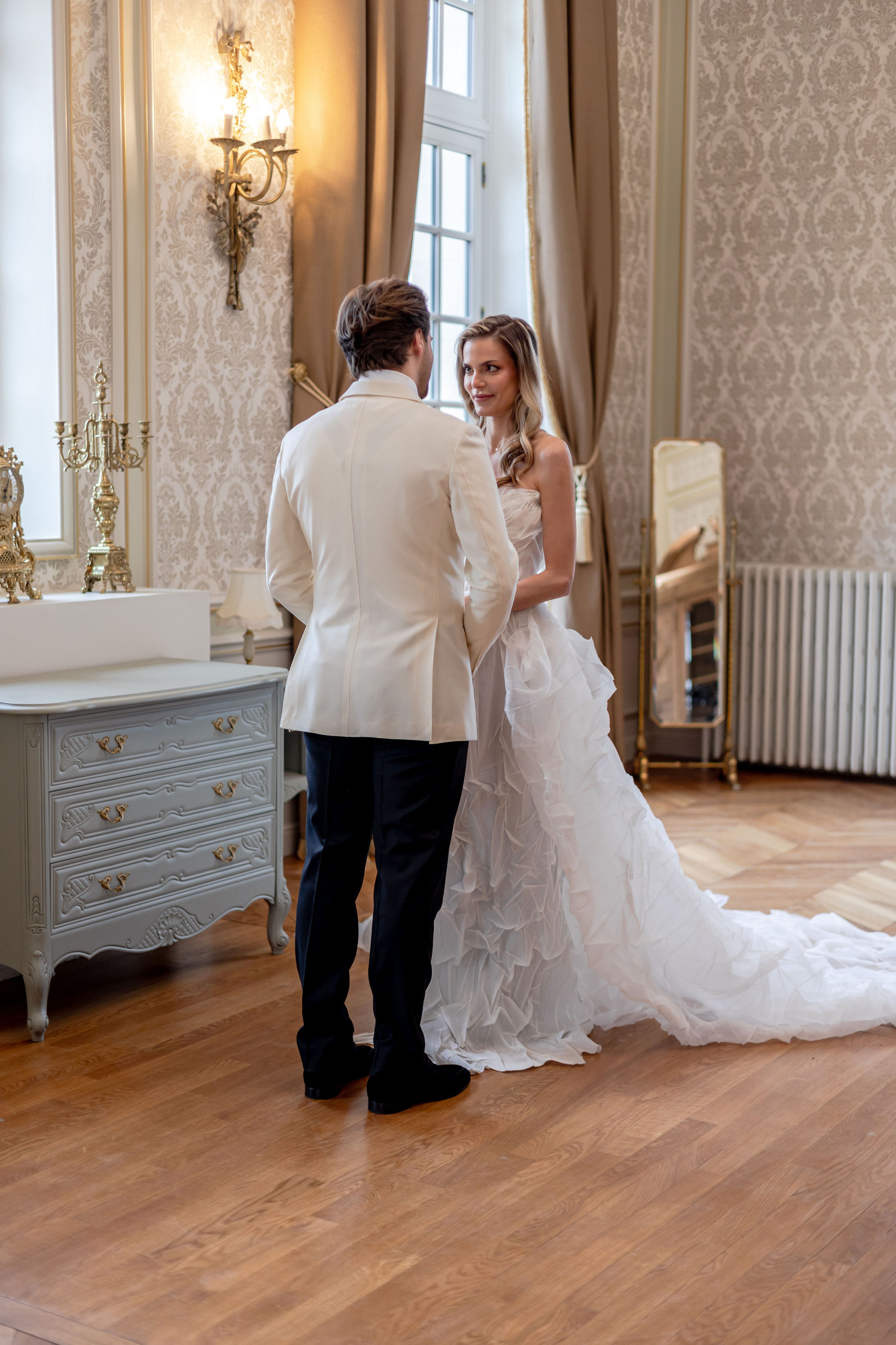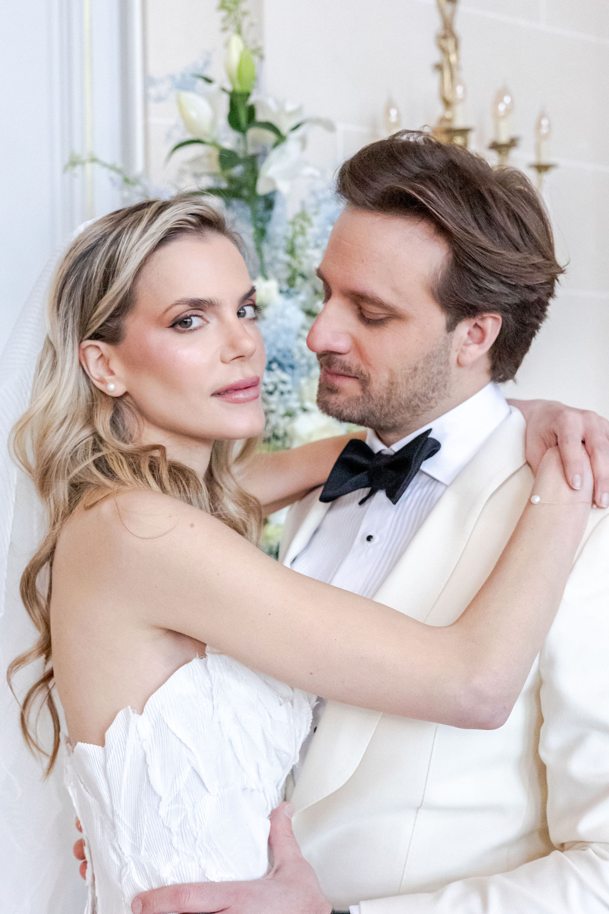 The groom, in Suitsupply, was styled with the same discipline. His look brought balance to the composition — polished, understated, and fully aligned with the mood rather than trying to dominate it. Shoes by Belle Belles and Jimmy Choo, along with jewelry from Sohelo Bijoux Mariage, completed the visual language with just enough light and refinement to sharpen the overall effect. Nothing was decorative for decoration’s sake. Every element worked to keep the focus where it belonged: on connection.