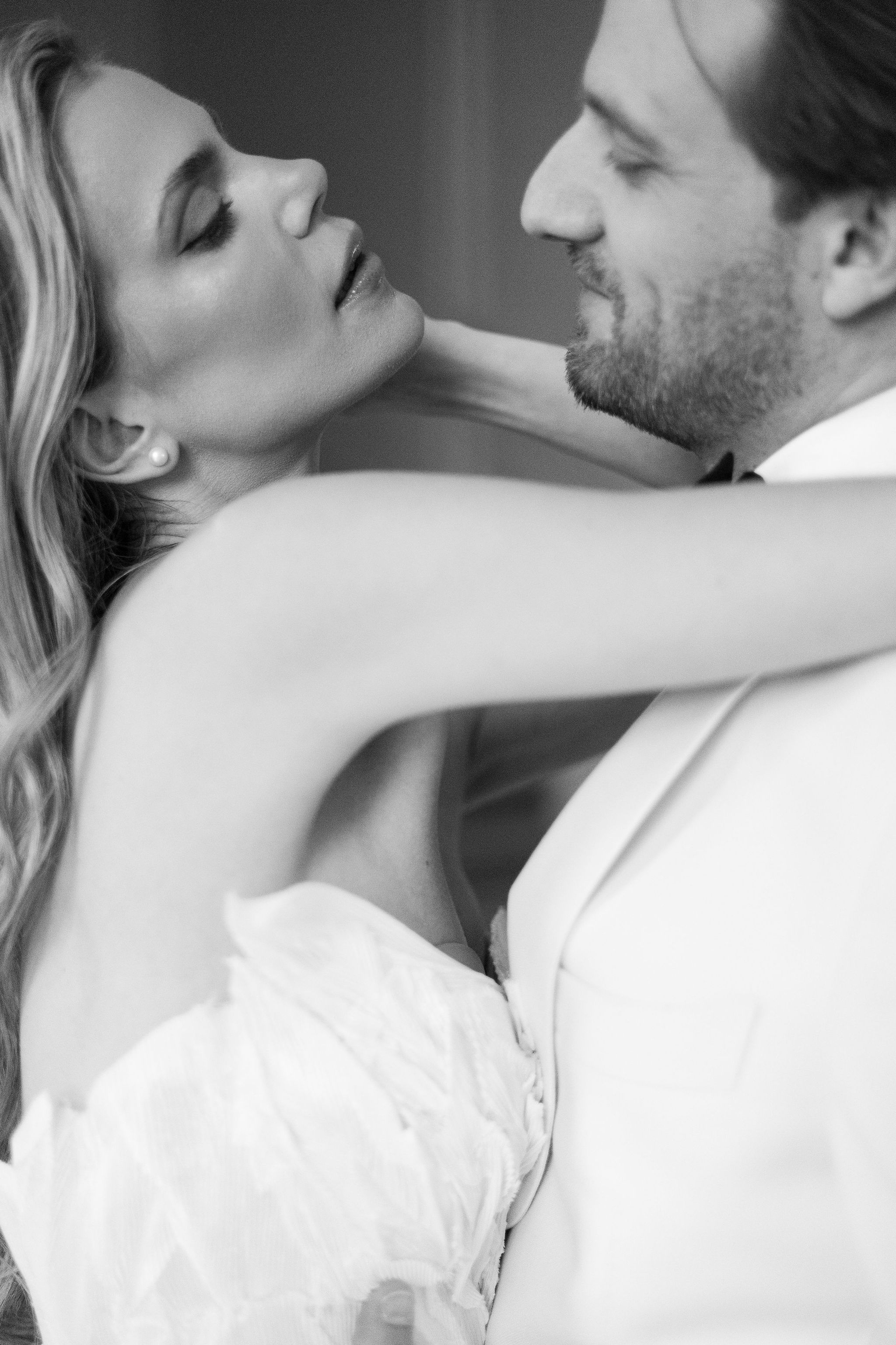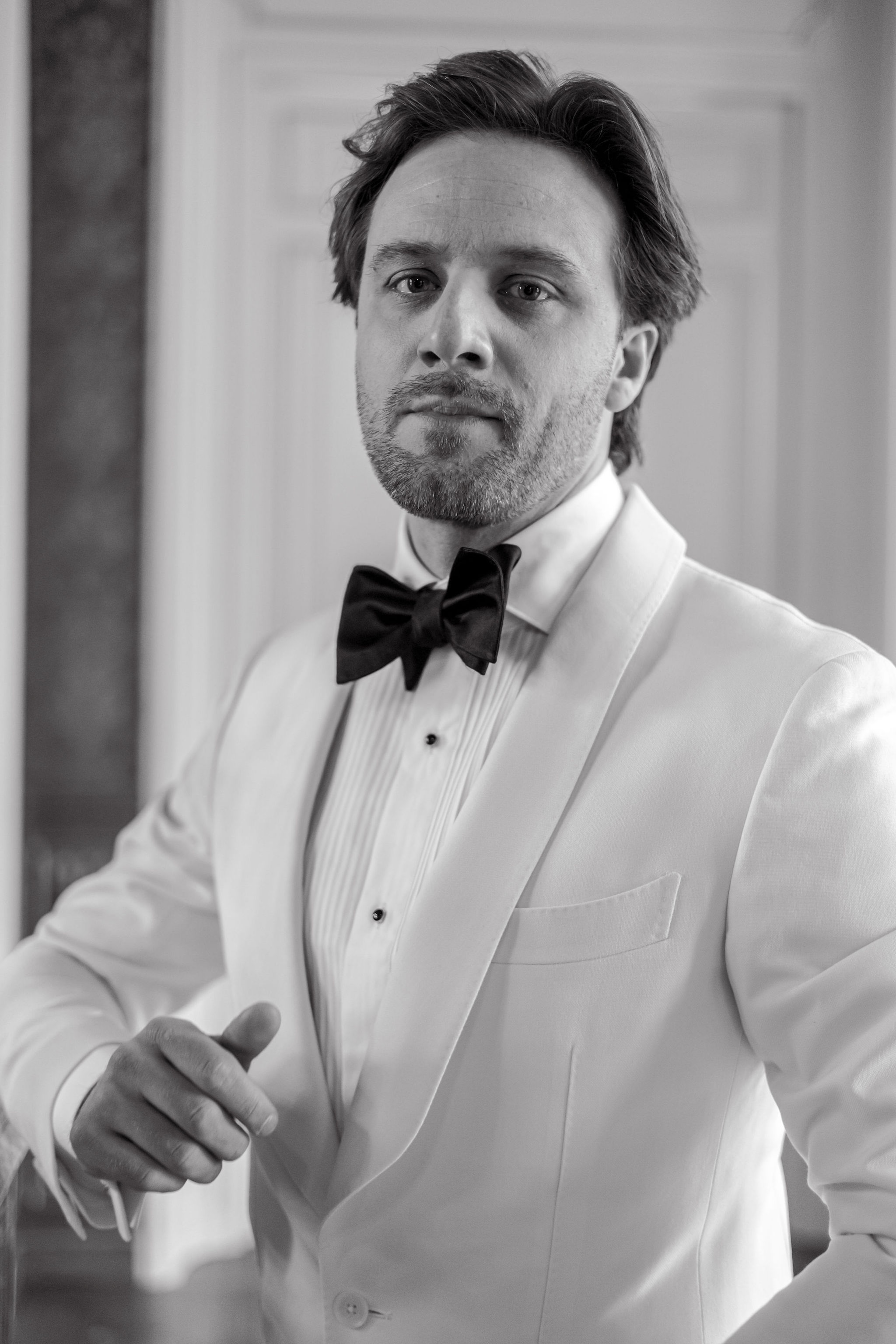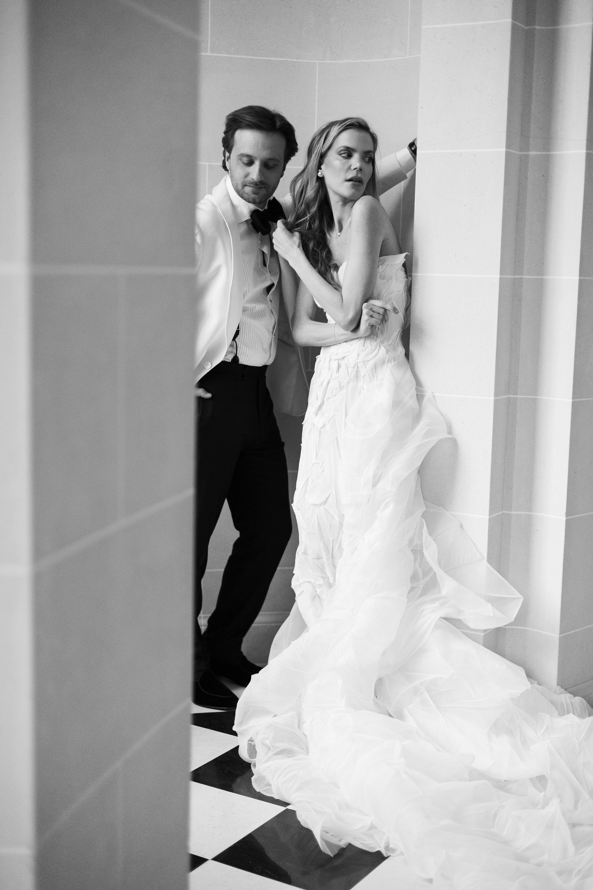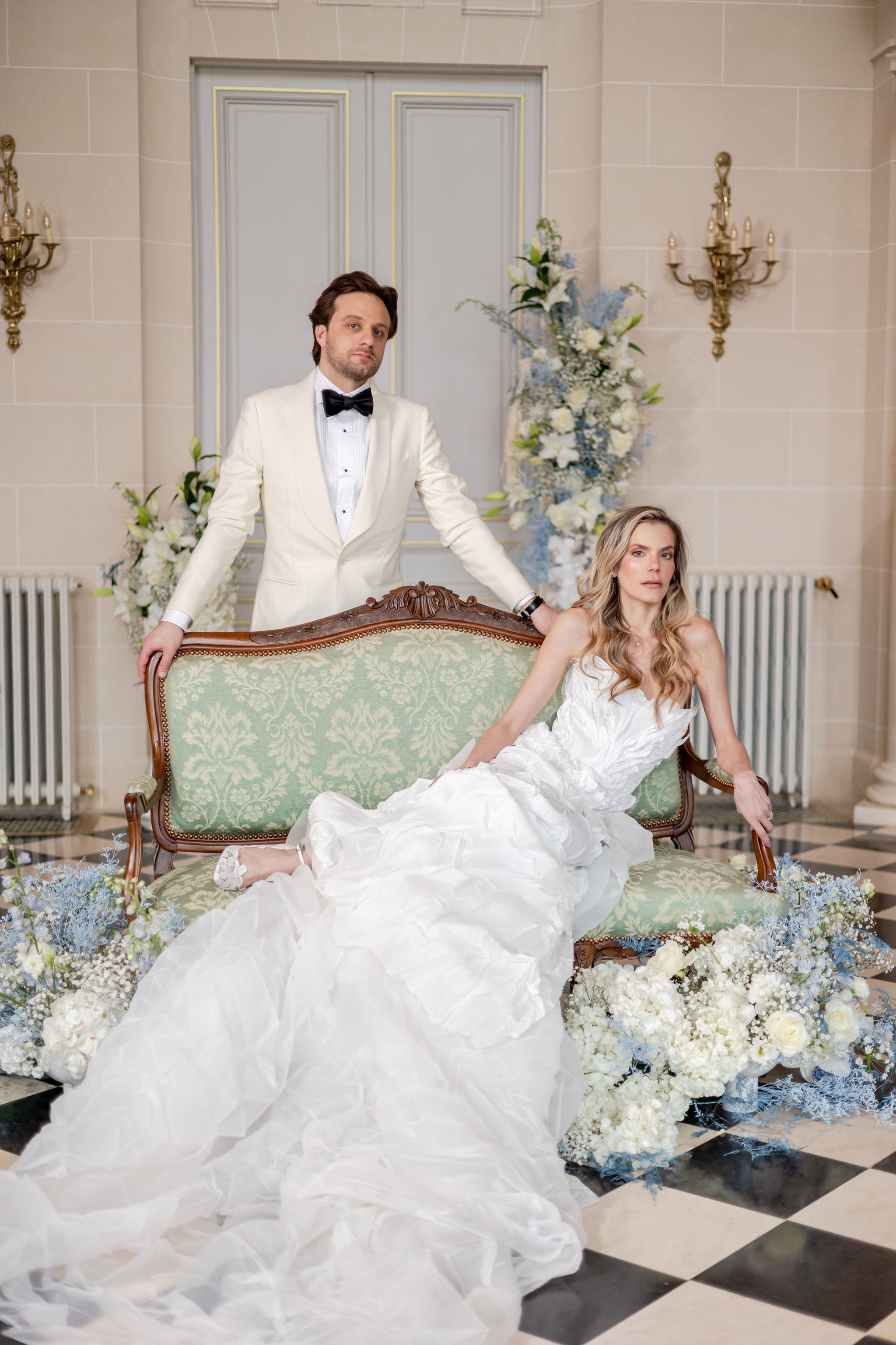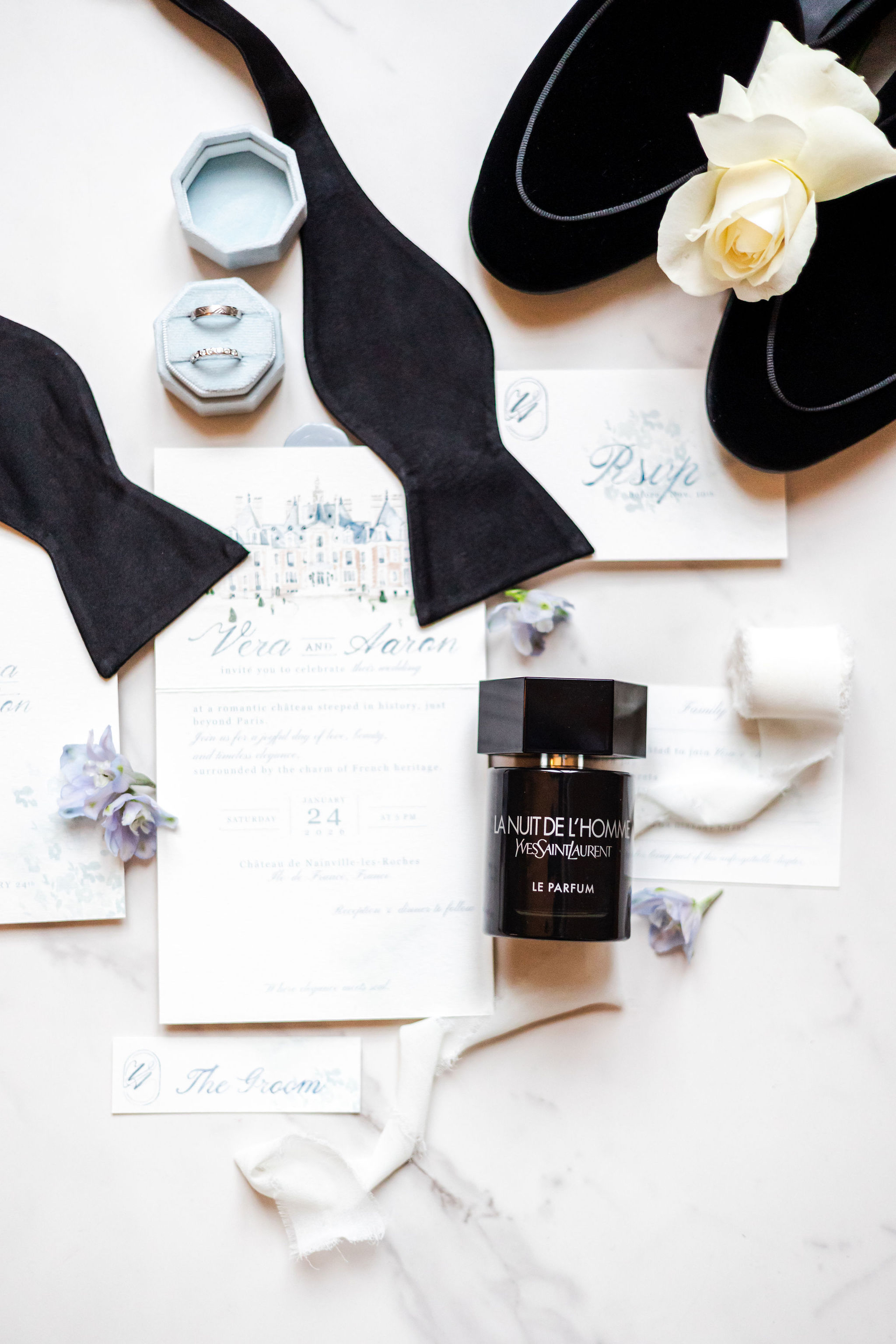 The groom, in Suitsupply, was styled with the same discipline. His look brought balance to the composition — polished, understated, and fully aligned with the mood rather than trying to dominate it. Shoes by Belle Belles and Jimmy Choo, along with jewelry from Sohelo Bijoux Mariage, completed the visual language with just enough light and refinement to sharpen the overall effect. Nothing was decorative for decoration’s sake. Every element worked to keep the focus where it belonged: on connection.