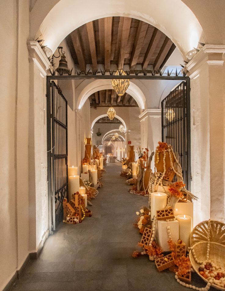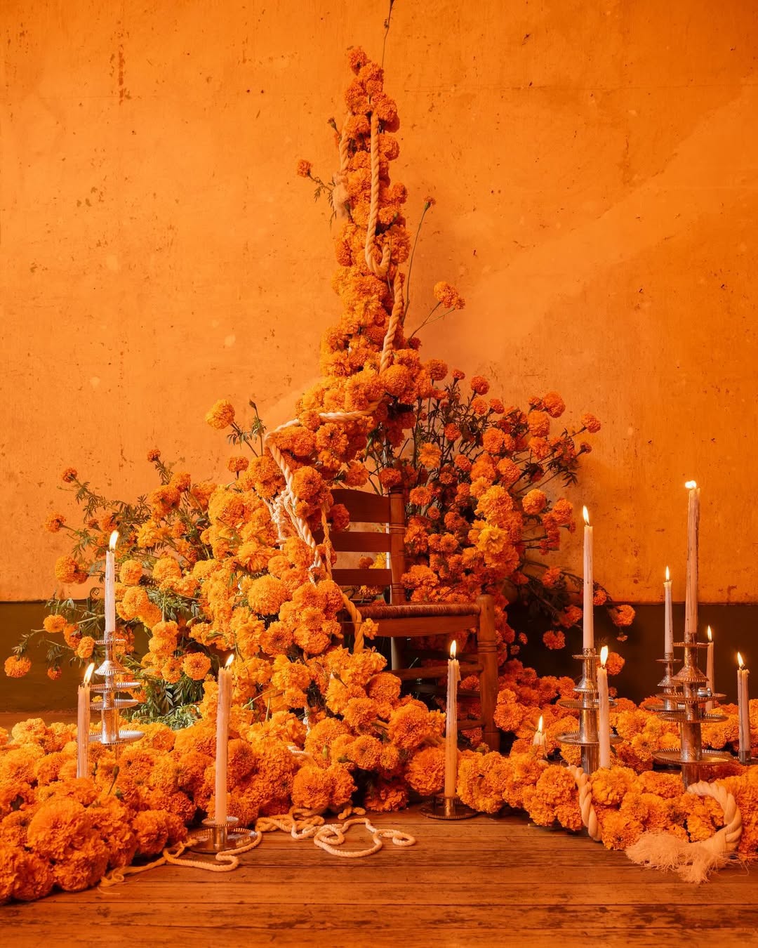 Go all in with an explosion of orange marigolds that creates an absolutely unforgettable ceremony backdrop. Think floor-to-ceiling installations where thousands of blooms create a golden-orange cloud around a simple chair or bench. Add clear acrylic candle holders at varying heights to bring dimension and that romantic candlelight glow. This works beautifully against a bold orange wall for a monochromatic moment that's pure drama, or let it stand alone as a statement piece that needs nothing else.