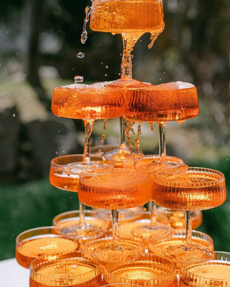 A drink tower featuring orange beverages is both functional and gorgeous. Layer Aperol spritzes, blood orange mimosas, or peach cocktails in glass coupes for a show-stopping display. Add fresh orange slices, rosemary sprigs, and coordinating straws to complete the look.