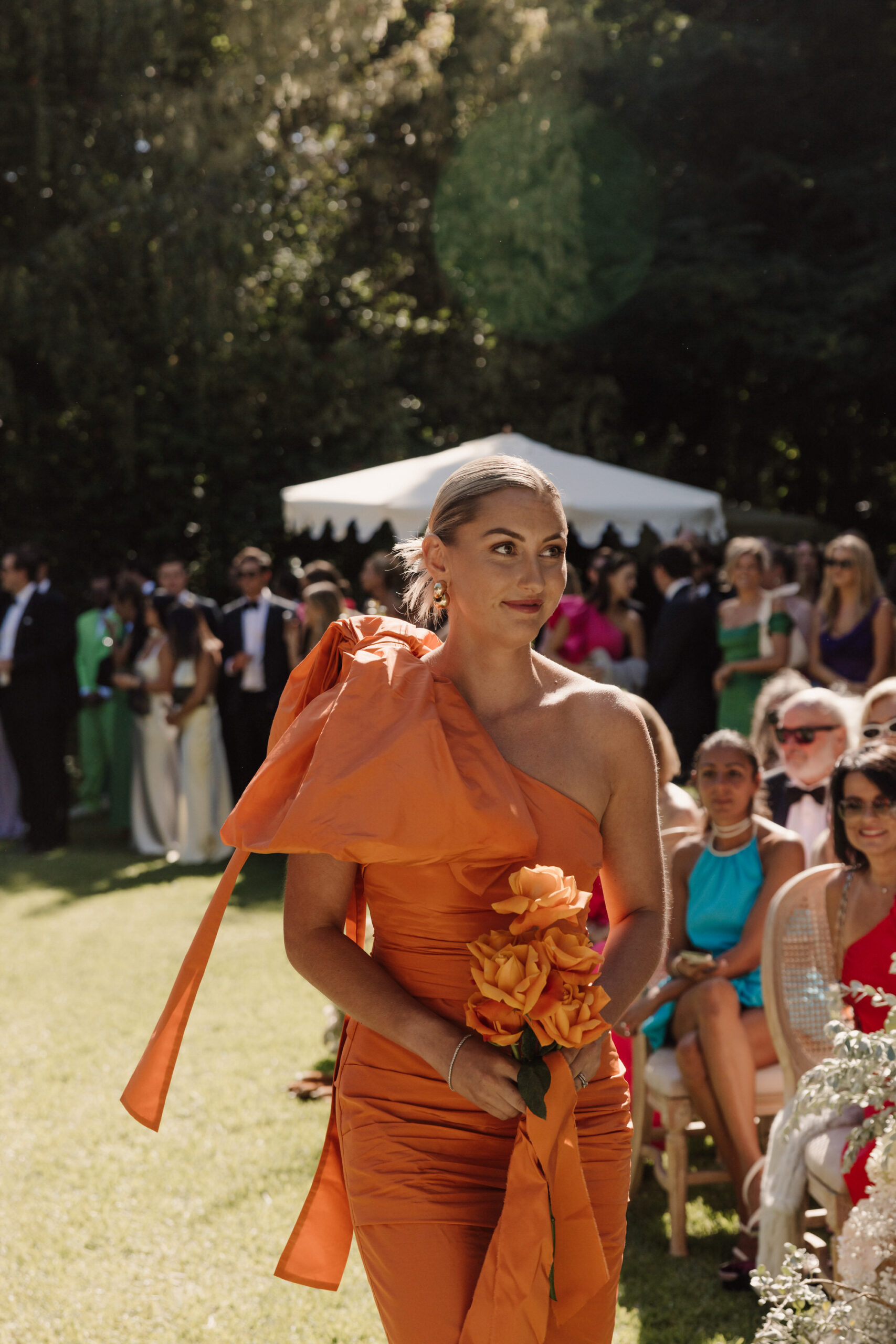 Don't forget about your bridal party. Your bridesmaids can carry complementary bouquets in softer peachy tones, or you can give them all-greenery bouquets that make your orange blooms pop even more.