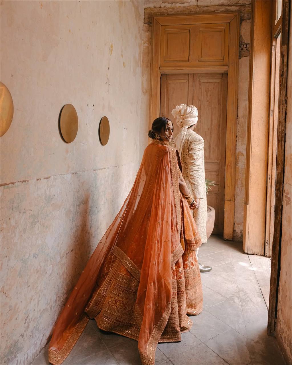 If you're not ready to commit to a full orange dress, consider these options: a white gown with orange embroidered details, a peach-toned underskirt that peeks through layers of tulle, or a removable orange overskirt for your reception. Terracotta and rust tones work beautifully for autumn weddings, while bright tangerine shades feel fresh for spring and summer celebrations.