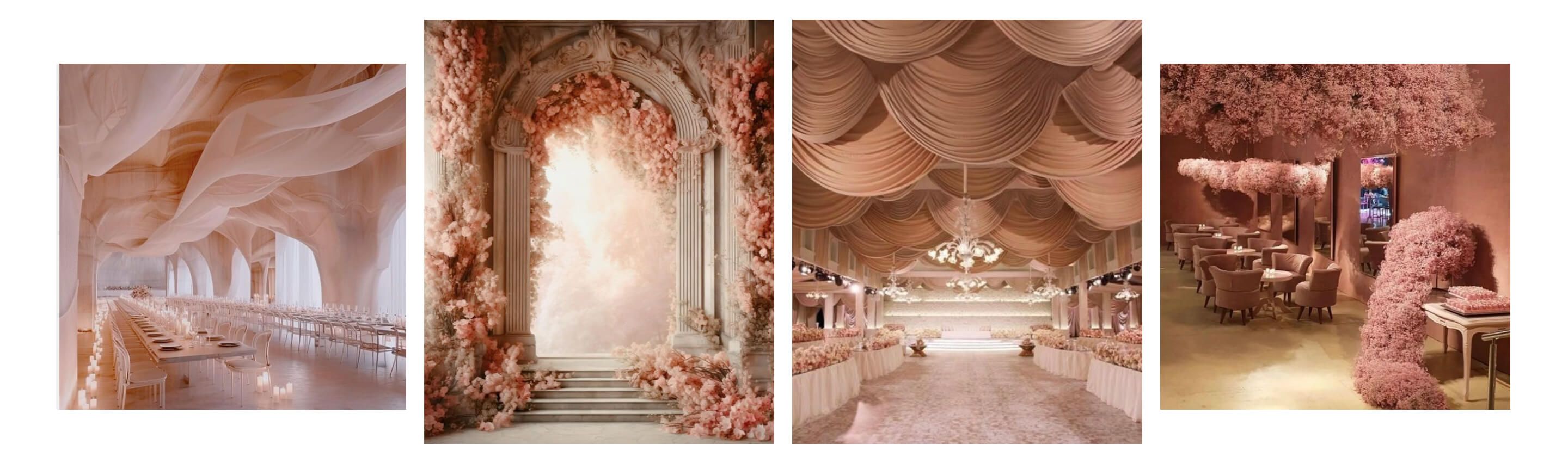 To build a truly elegant peach atmosphere, begin by incorporating the color in your textiles and floral elements. Think sheer peach drapery fluttering in the breeze, soft linen table runners, and silk ribbons tied around bouquets. Layer different shades of peach — from soft blush tones to warm apricot — to create visual interest without overpowering the space.Lighting enhances the peach palette beautifully. Use warm, ambient lighting to reflect the natural glow of the color — candlelight, string lights, and golden-toned uplighting will highlight the peach tones and bathe your venue in warmth. Florals like garden roses, peonies, tulips, and dahlias in soft peach tones will bring the look to life, especially when styled in loose, organic arrangements with touches of greenery or cream-colored blooms.The key to an elegant peach atmosphere lies in balance — letting the color breathe while grounding it with refined textures and gentle lighting.