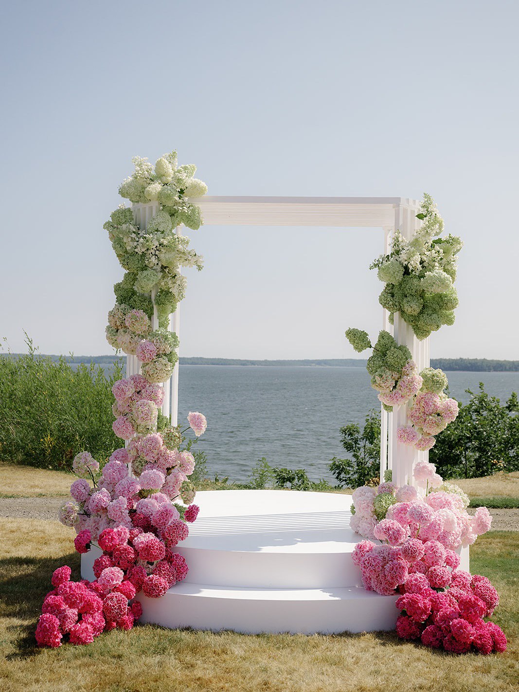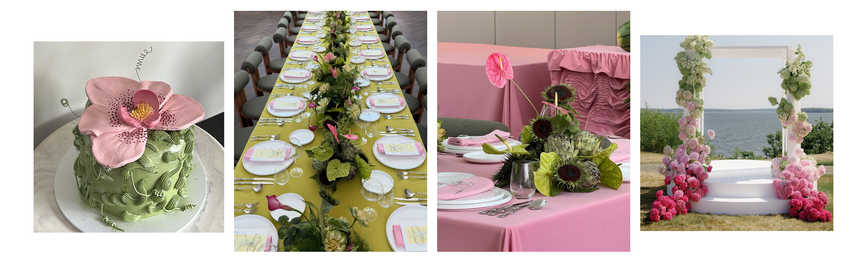Modern minimal wedding: Feature pistachio and pink as standout color touches on a mostly white or cream background. Try one bold installation in these colors, simple tables with single-color napkins, and a clean cake with a soft ombré effect. Here, pink is an accent, not the main color.