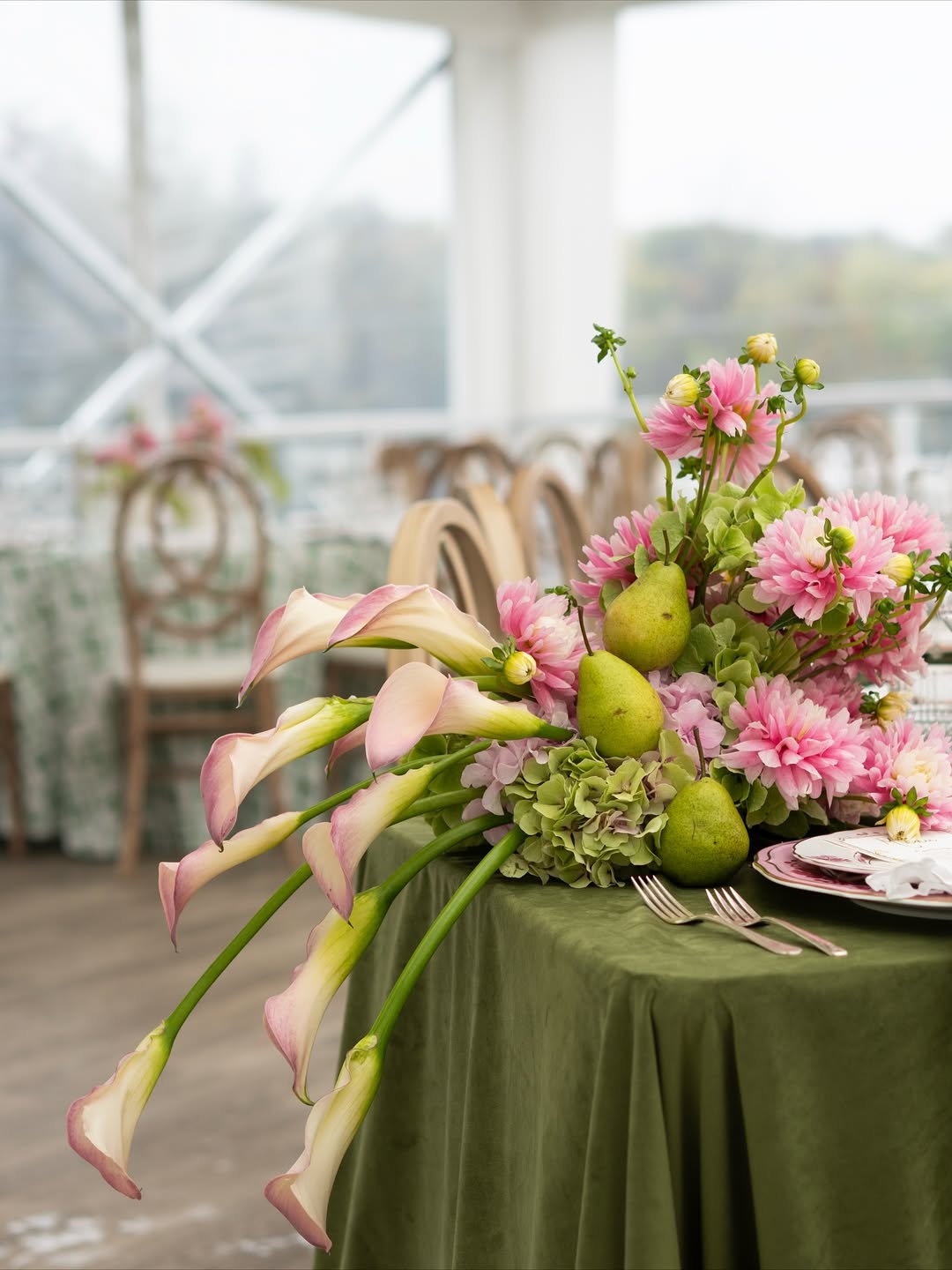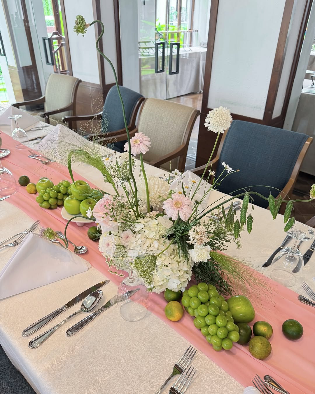 For large installations, start by building a base with greenery such as eucalyptus (especially the dusty types), olive branches, lamb’s ear for its silvery-green foliage, Italian ruscus, and seeded eucalyptus. This creates the pistachio foundation. Add pink flowers as focal points instead of spreading them evenly—use garden roses in blush to deep pink, ranunculus, sweet peas if they’re in season, hellebores, and anemones with dark centers for depth. Table arrangements should look full but not crowded. Choose low, sprawling designs over tall, formal ones to create a relaxed, garden-inspired feel. Mix different flower sizes and shapes: use large roses as the main focus, fill in with smaller spray roses or ranunculus, and add sweet peas or cosmos for movement. The pistachio element comes from the greenery, with its grey-green leaves and stems tying the look together, even if the pinks aren’t all the same shade.