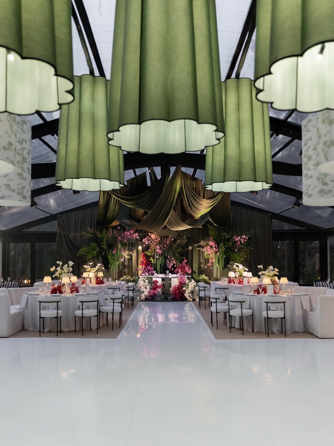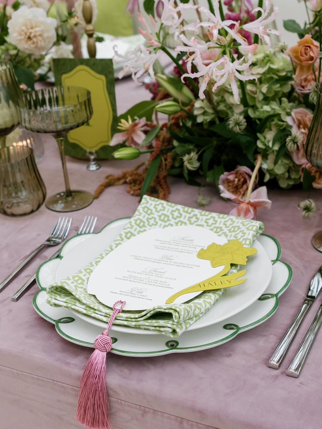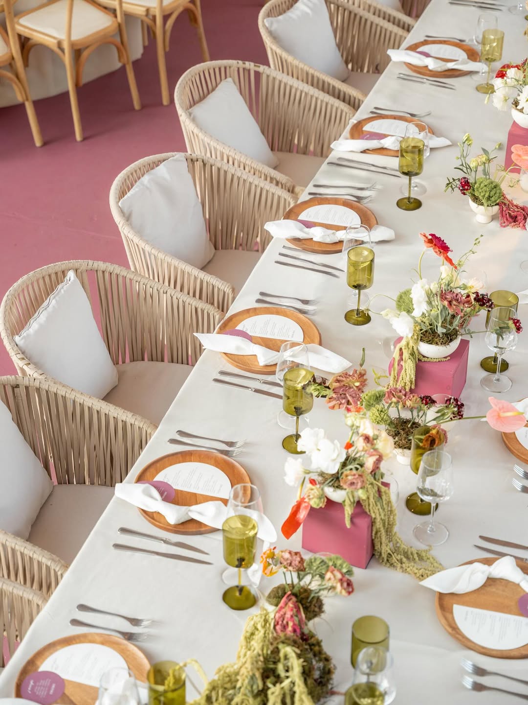 - Textiles: Pistachio silk or linen runners down the center of white-clothed tables, pink napkins folded simply (no elaborate origami that reads dated), or reverse—soft pink table linen with pistachio napkins and ribbon details