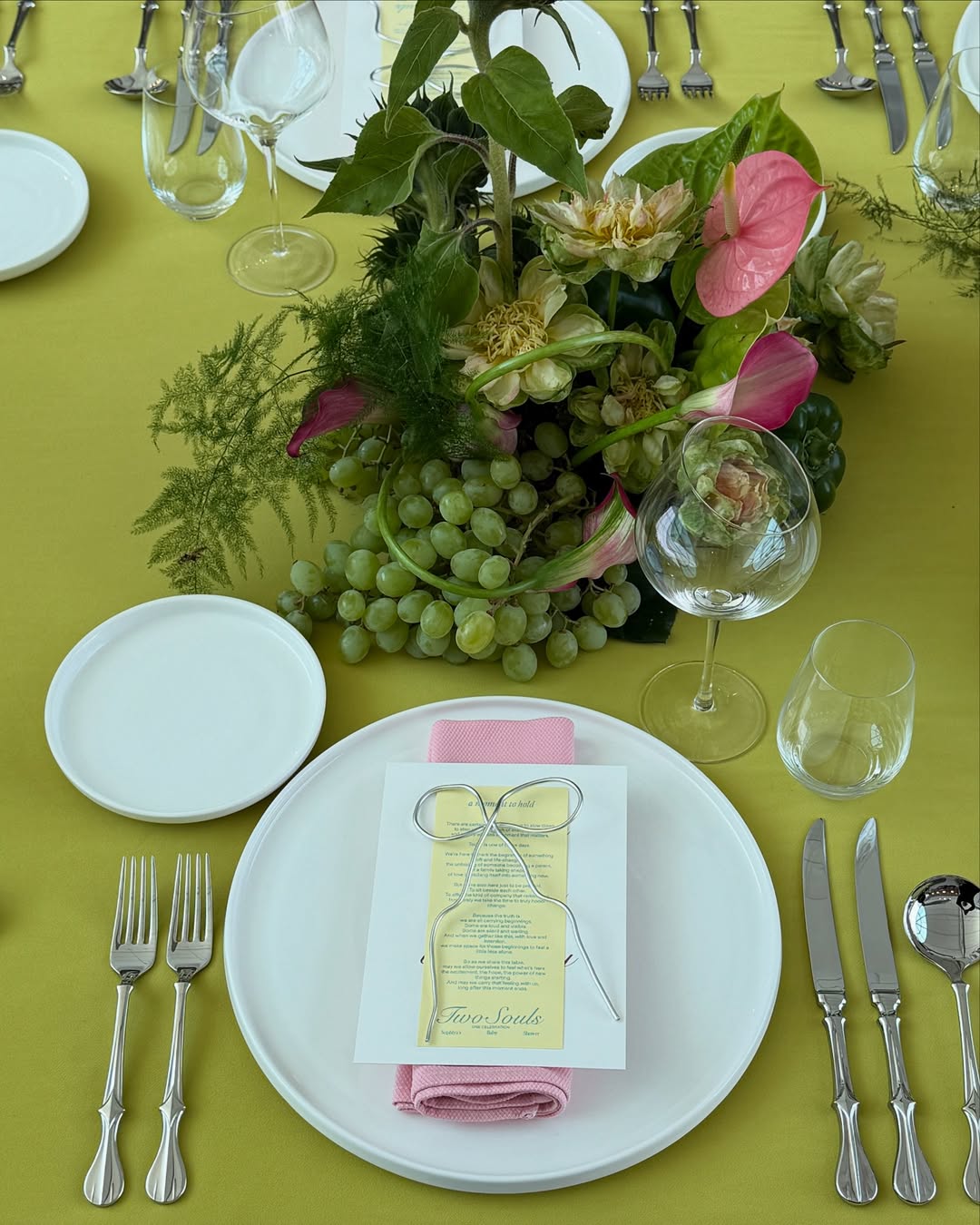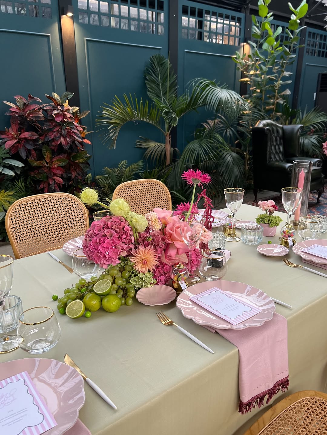 Tablescapes with pistachio and pink need the right level of restraint to avoid going too sweet. The trick is using one color as a dominant presence and the other as an accent, not spread evenly. Pistachio tablecloths or runners add sophistication to the surface, making room for pink touches — napkins, flowers, details — to shine instead of overwhelm. In the other case, a neutral base (cream, white, natural linen) allows both colors to look like intentional accents rather than a complete immersion.