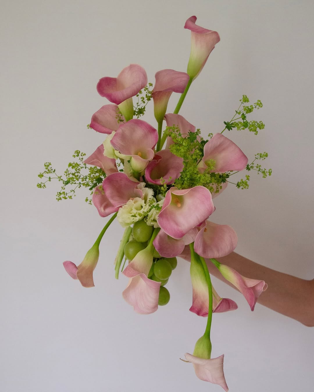 A blush pink wedding bouquet looks beautiful when you mix different shades of pink. The colors do not have to match exactly—try combining soft blush with deeper rose, all brought together by pistachio-toned greenery. The shape of the bouquet is just as important as the colors. Rounded, structured bouquets feel more formal, while loose, organic shapes with visible stems and trailing pieces look more modern. Tying the bouquet with pistachio or pink silk ribbon and leaving the stems visible, rather than covering them with satin, keeps the arrangement looking natural and fresh without feeling too fussy.
