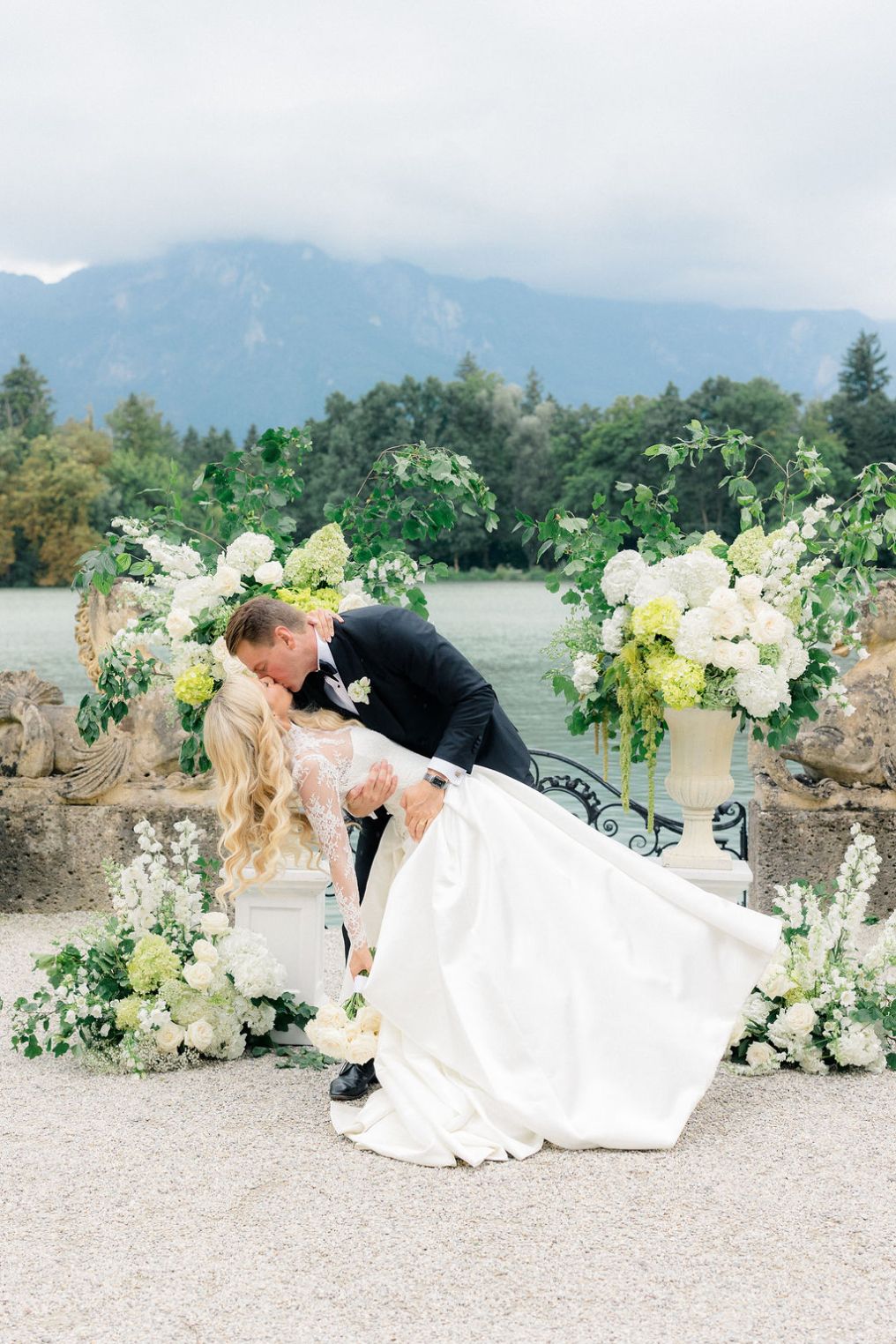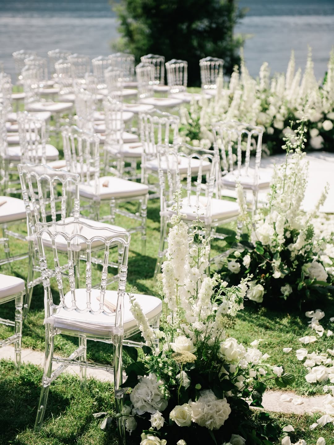 "I drew inspiration from the couple's striking baby blue eyes to create a showstopping ceremony that became the coup de théâtre of the entire event," recalls the Monaco-based planner. The resulting design featured an ombré pathway of blue hydrangeas and delphiniums leading to a suspended floral arch above a mirrored stage, creating reflections that seemed to merge with the lake itself.