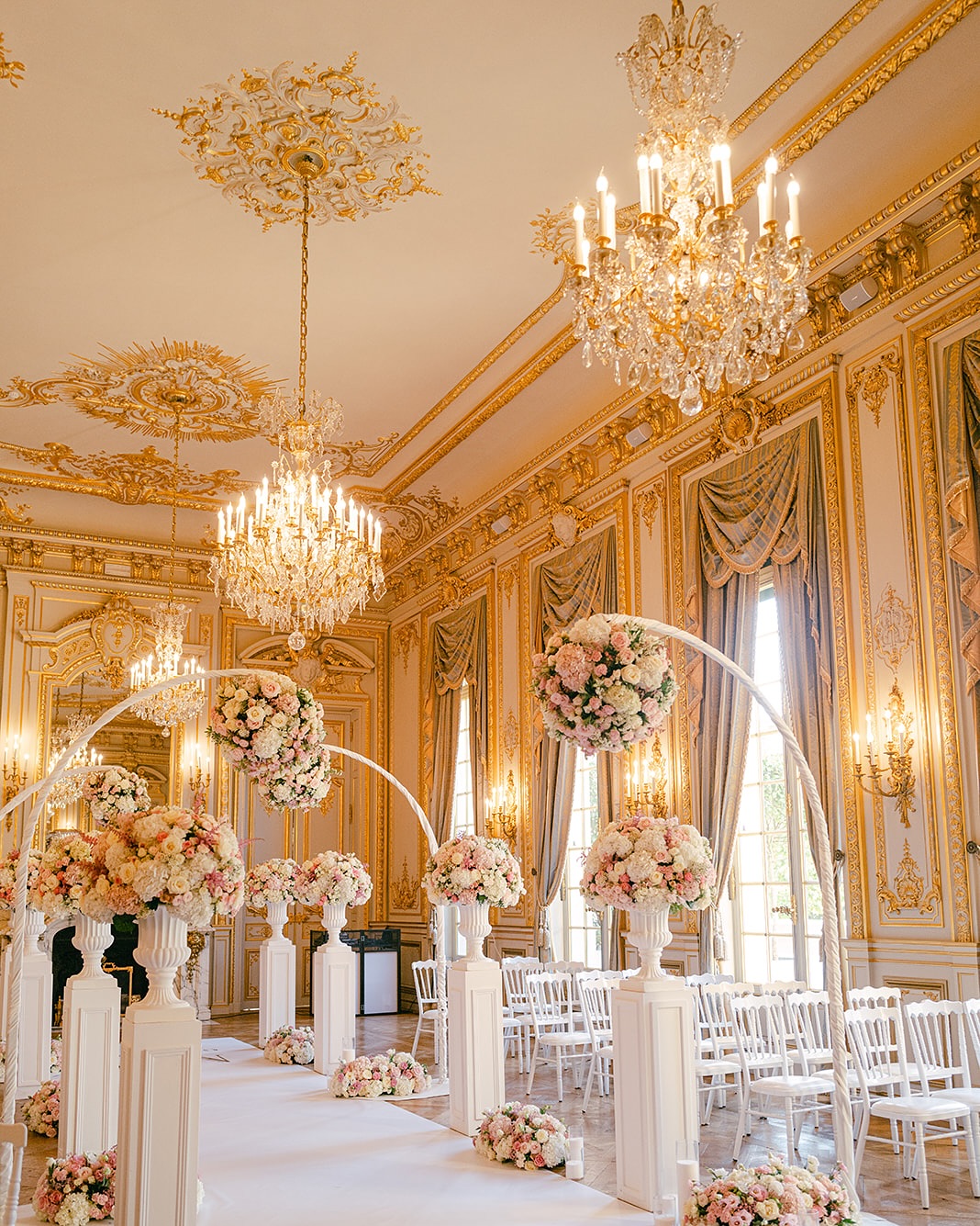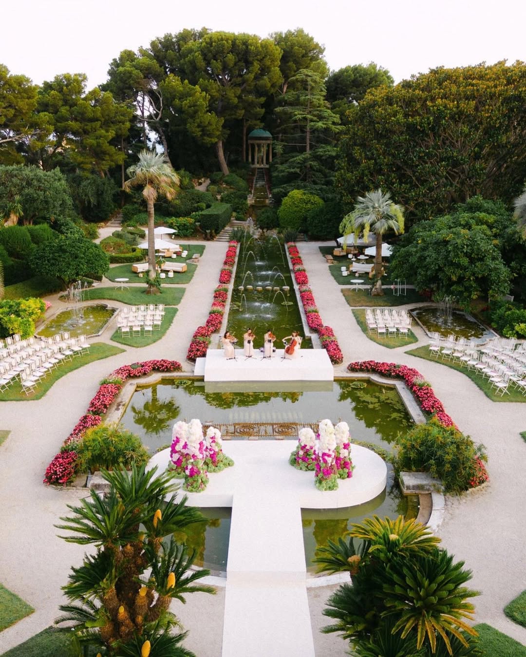 Dream Paris Wedding created environmental storytelling in a château celebration where "the ceremony took place in the formal gardens, framed by a bespoke floral 'mirror' installation designed to reflect the fountains behind the vows." This wasn't decoration—it was performance architecture that used reflections to multiply visual impact while creating symbolic depth.
